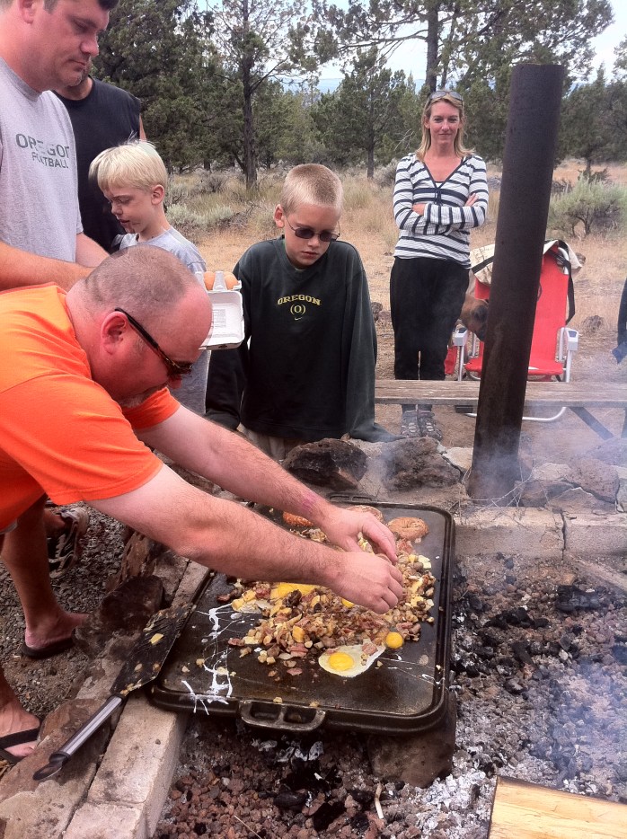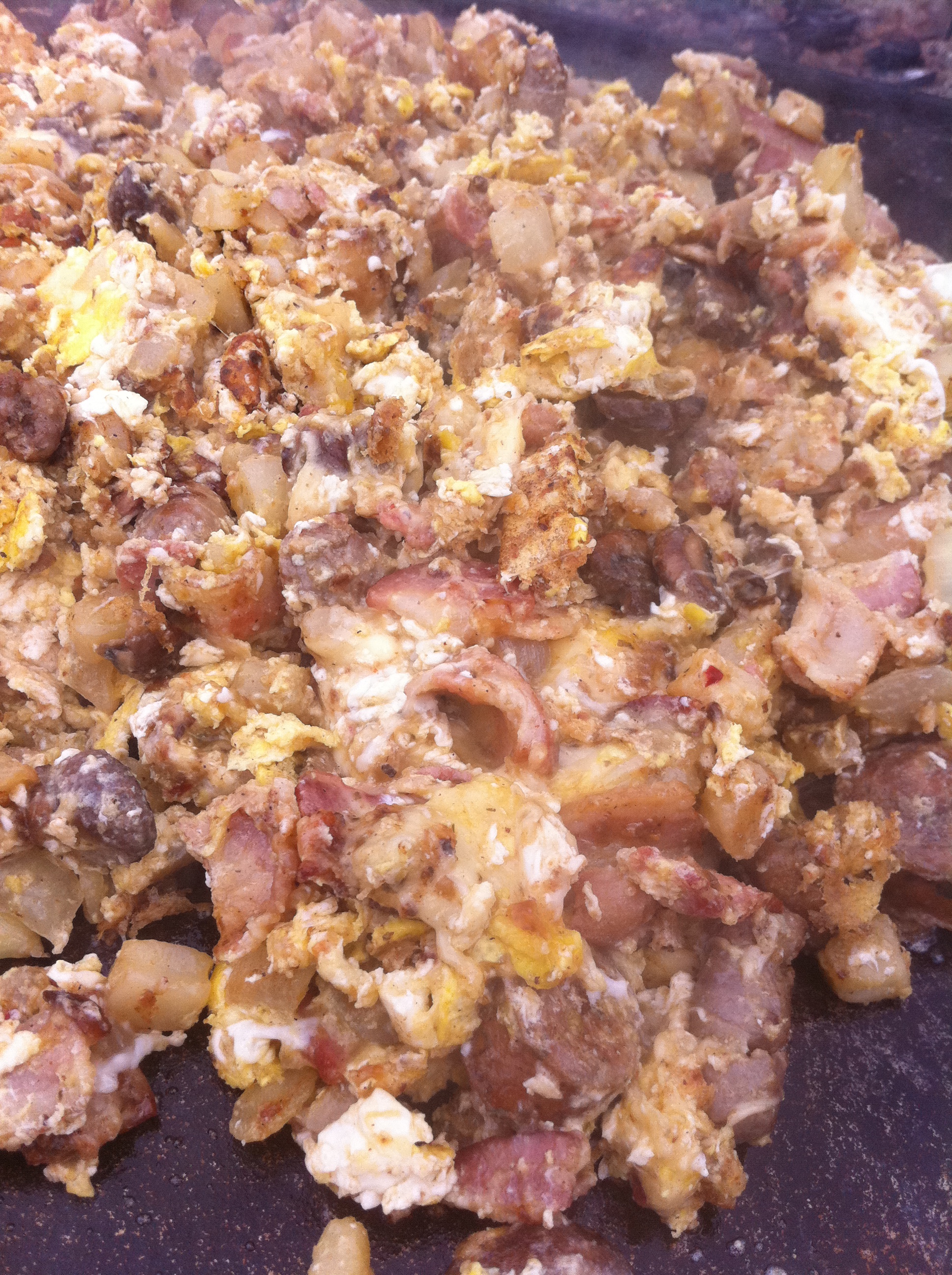 The next morning, I was called up from the bull pen to bring out the Big Iron. When I say Big Iron, I mean exactly that. My good friend, Grover had this World War II griddle that he found at some antique store and every time we go camping he would bring it and his son and I would argue who was going to get it in the will. Finally, Grover had enough and decided we could go have it recasted and poured and we would market them because you cannot find them anywhere. When the product was completed we learned that the skillet was 60 lbs and cost us too much to ship it. So I had the big boys make me a fire, and we were gonna make what I call the “Kitchen Sink”, because we throw everything into this except the kitchen sink.