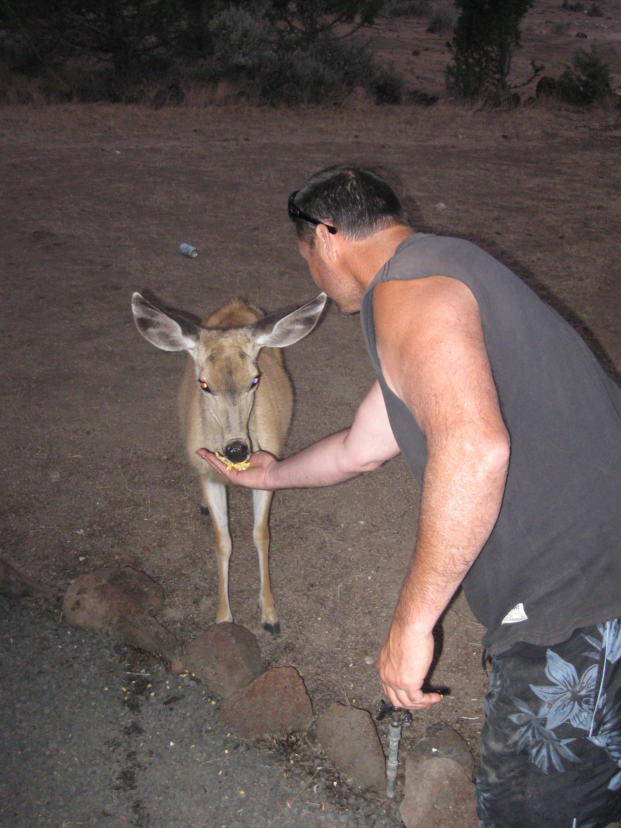Wayne is about 6’5″ and two inches shorter than Todd. Wayne is tall and big, he is very sensitive. Here is Big Wayne feeding the wild life pototoe salad. This little doe will probably not make the cute little poop pellets like she should tommorow morning.