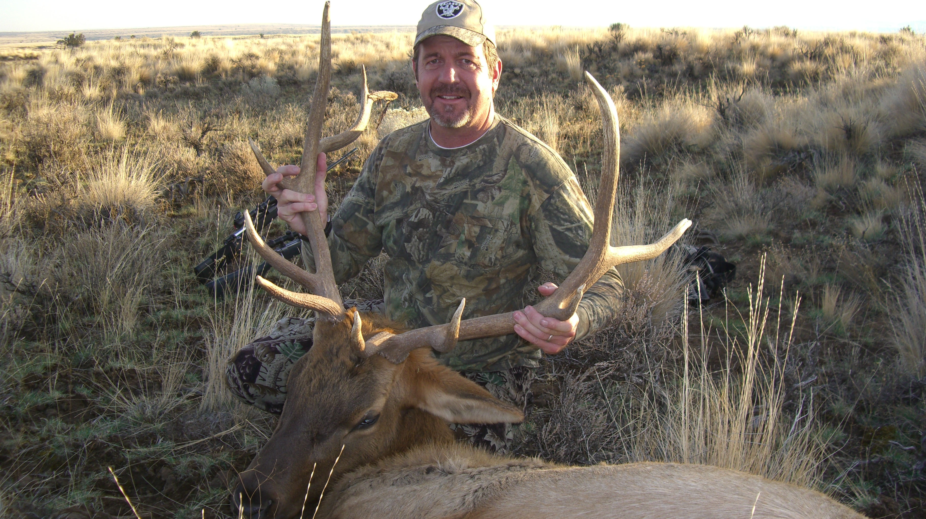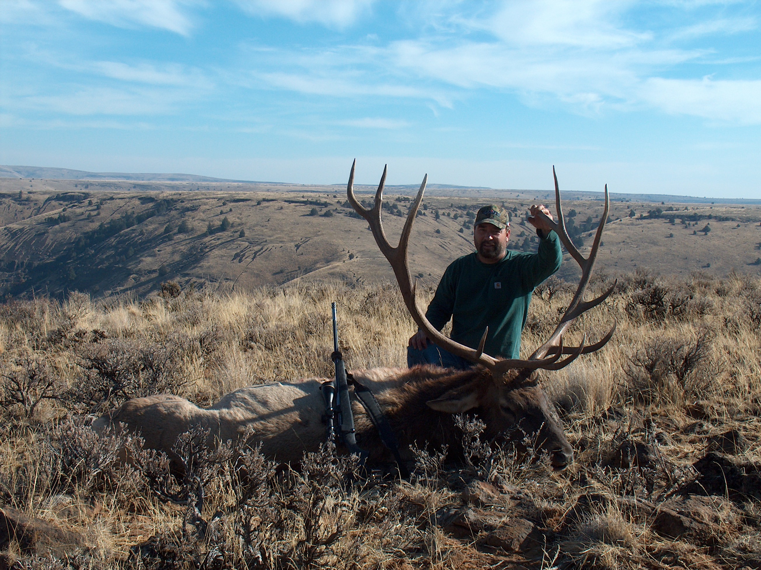About 20 years ago there were no elk in Central Oregon, also considered high desert country. They migrated off of Mt. Hood once they figured out looking from the mountain to the East that there were nice bushy green spots and clear water lakes. So they began to show up in Shaniko country in pursuit of barley, wheat, alphalpha, CRP, and fresh water. When I first arrived on the scene, the elk herd was less than fifty and today there are a handful of herds roaming the area and some herds the size of 100 or more. Wapati, that is what their Native name is from the Indians, which means white ghost. This is because they have the tan butts than you can see when they run from you. They have great noses, and good eye sight. Which means when they are running in a herd they have a hundred sets of each all trying to bust you from your hunt. In the high desert, there is nothing really to hide behind, and the wind often changes directions which makes hunting them difficult. To make matters worse, when I am hunting for them I am bow hunting that happens to be my preference. When I am guiding, most of the time it is clients with rifles and even that task can be very difficult.