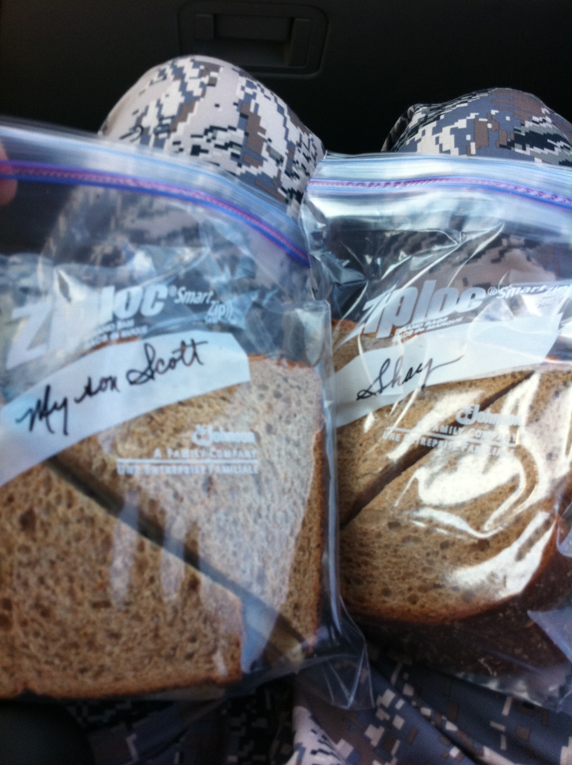 The next day Pat took us out to another hunting spot to no avail. We then headed back up to the mountain. As we drove I got the sandwiches out of the cooler and noticed that Leona wrote something on the sandwich bag. Pat and I also noticed that Scott got more meat on his sandwich than us.
