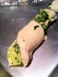 I had a little pesto left over so I rolled flour and thought why not, might be a little over whelming in the same flavor but I wanted to test it out for future references.