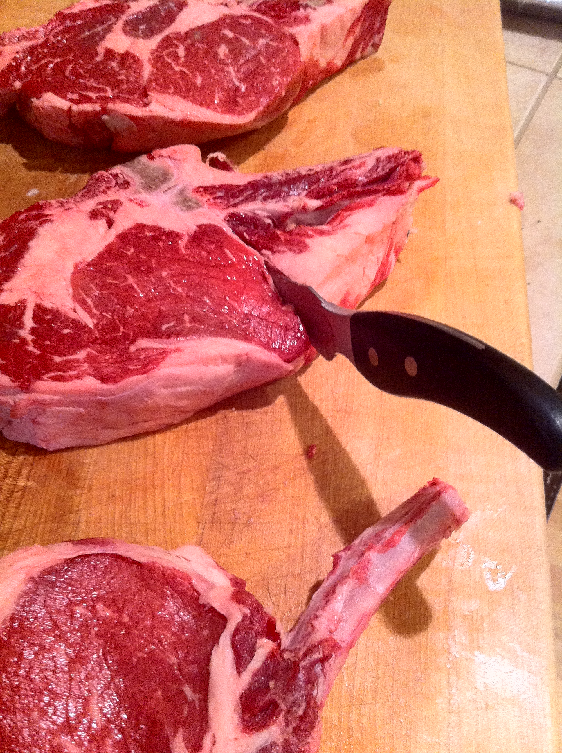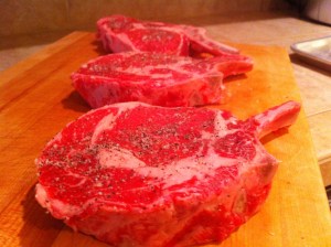 We selected the bone in Ribeye steak, how can you go wrong with marble fat? I like to cut the fat off the bone and make it into a cowboy cut.
