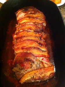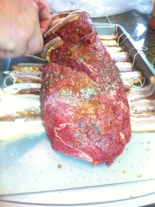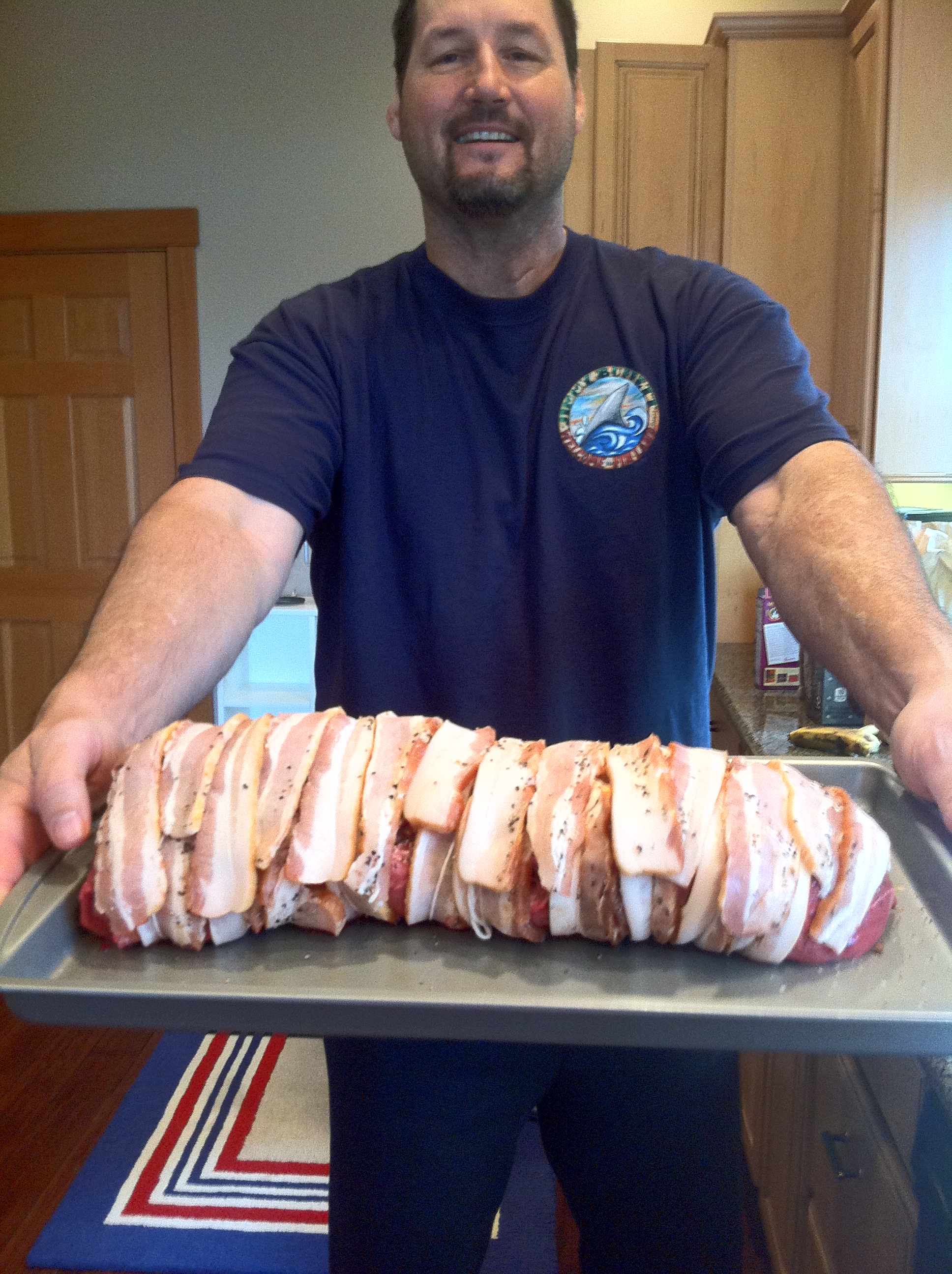 The Thanksgiving holiday we spent with some family friends at the beach, they made a traditional fantastic turkey dinner with all the trimmings. Turkey makes me tired, not like just a little sleepy. It is like some one hit me with a Rhino tranquilizer dart. They say that it has DNA that affects us that way, but for me it is like a train hit me. The next three days we spent on the different part of the coast with my buddy Wayne and Sherry. This is where we first made the bone in pork loin. The next day, we decided to take a 20 pound beef tenderloin that I brought and make it for dinner because we had a large group of friends were visiting for dinner. Wayne said to me in his okey voice “Lets wrap that son of a gun in bacon”. I replied “Bacon??” He then looked at me with this strange look on his face and said “What the hell doesn’t taste good wrapped in bacon?” He is correct about that so off we went looking for some good bacon.