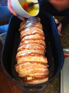 Wayne then brushed it down with garlic butter. I do not think this enhances the taste of the meat because it gets only on the bacon and you discard the bacon when serving. However, the sauce at the bottom of the pan that you use for pouring over the meat is great.