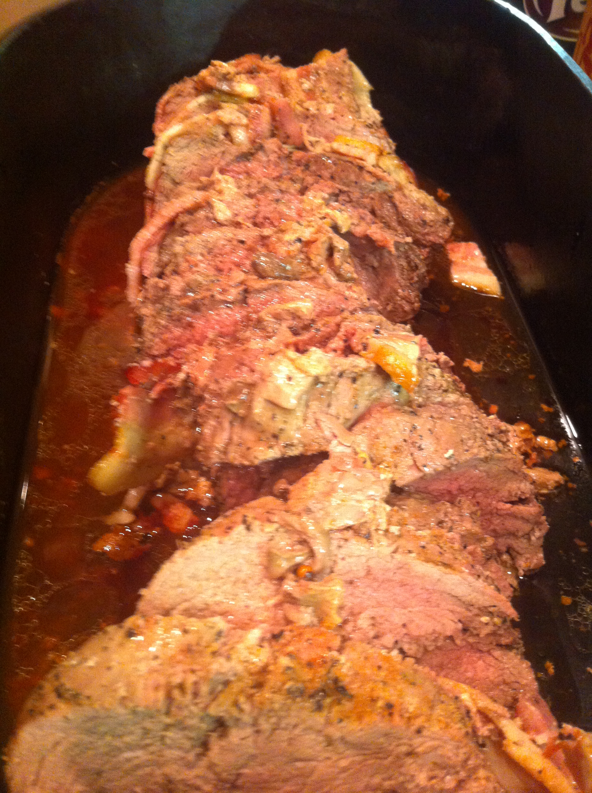 After it is sliced, then it is put back into the pot and juices to be served family style.