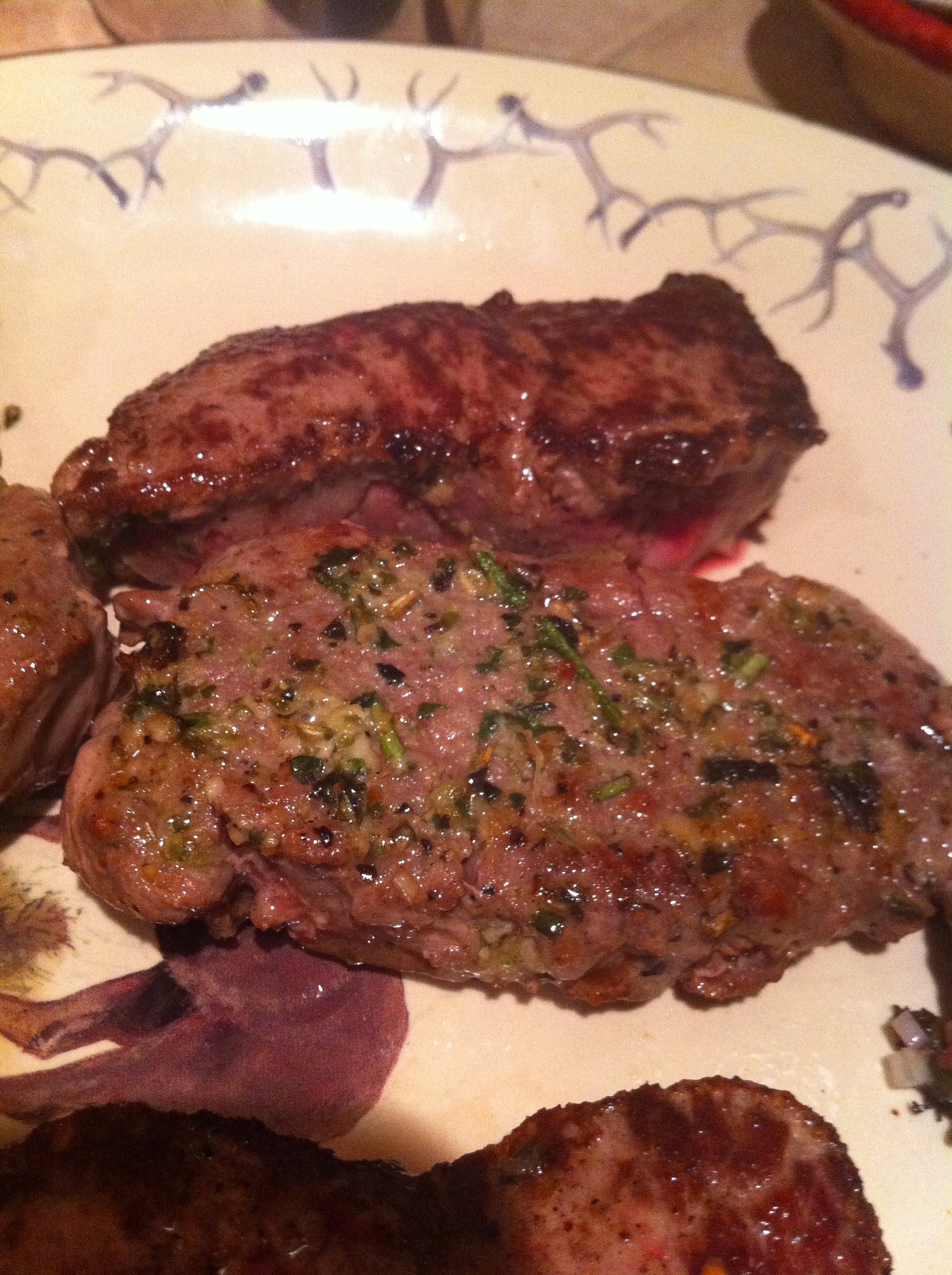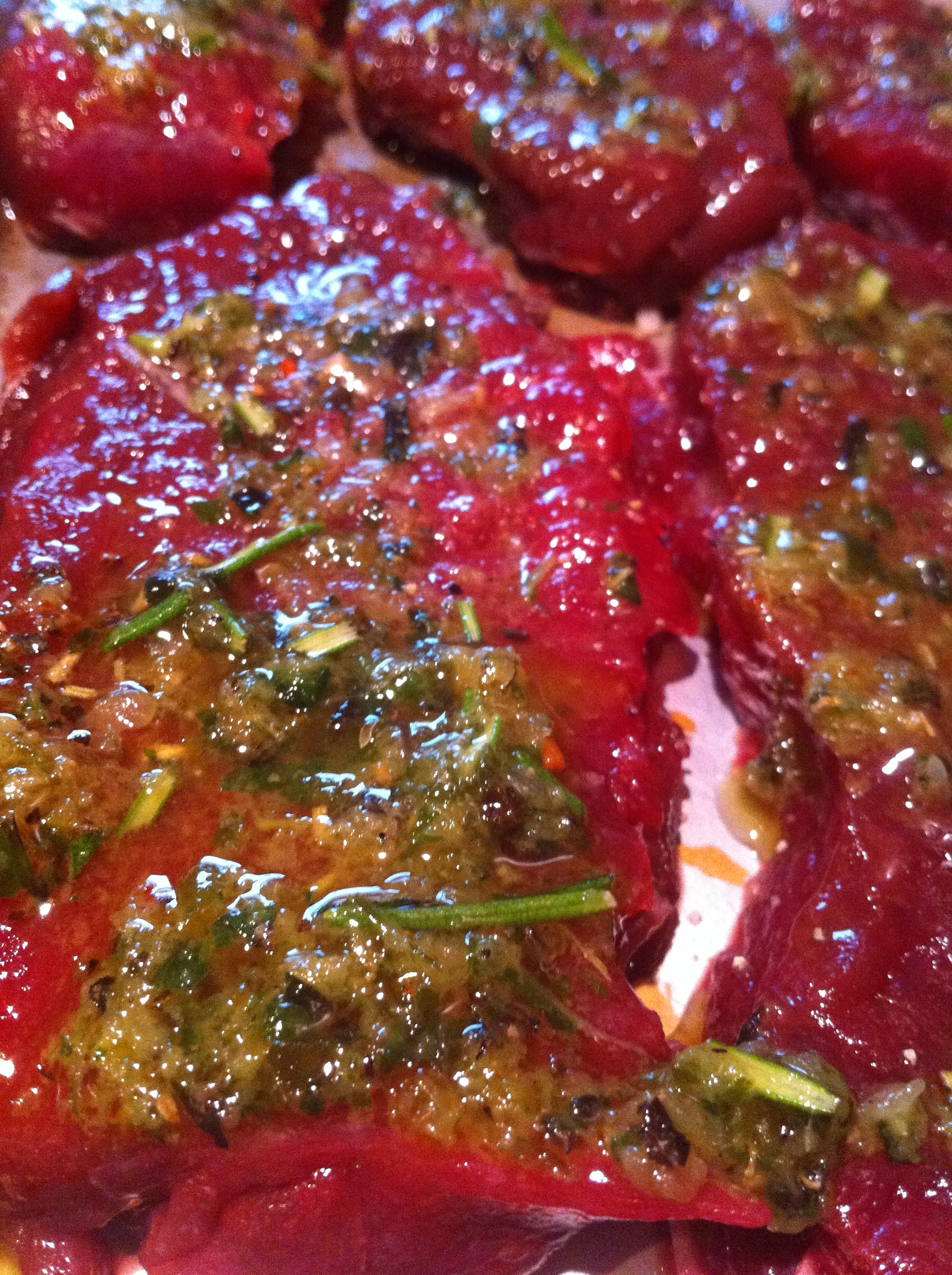 I used my handy mixer but you can do it by hand as well. Mix ingredients in a small bowl and add salt and pepper to taste. I take my meat out and bring to room temperature and marinate the above ingredients on the loins.