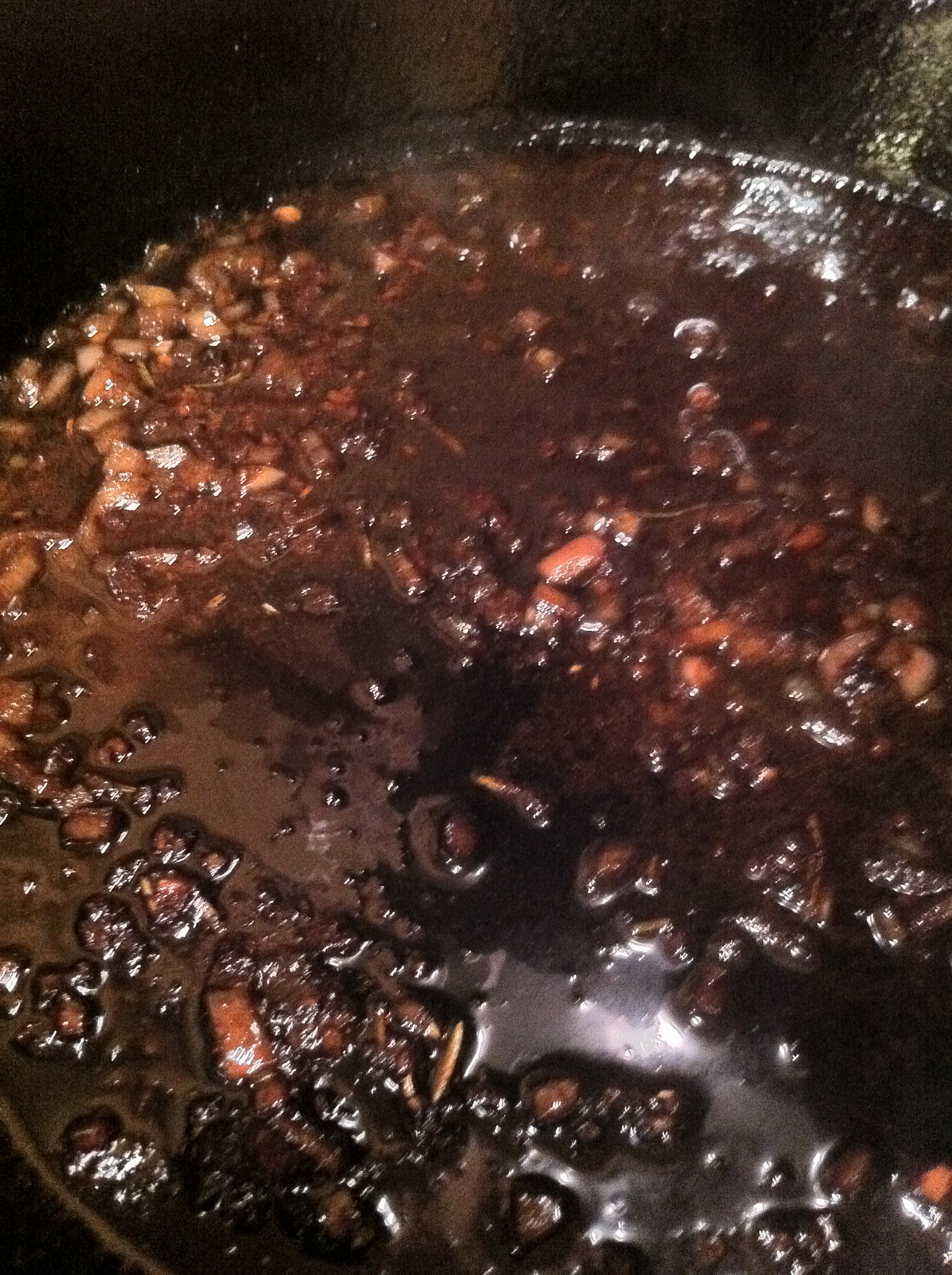 add the shallots and cook until translucent, about one minute then add garlic. Then add 1 cup of balsamic vinegar, and 1 large Rosemary sprig and bring to boil. Reduce the vinegar until only 1/4 cup remains. Remove from heat and add 2 tablespoons of butter.