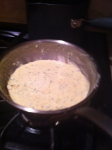 Take heavy cream and bring to boil and reduce to simmer in a pan until it is reduced by half. Remove from heat and add parmesan and Oregon blue cheese, parmesan, salt and pepper and nutmeg. Taste it, does it need more salt and pepper? Add some.