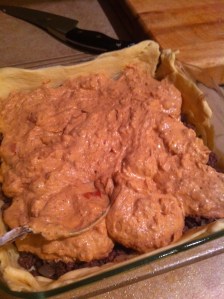 Put the meat in the dish that is layered with the dough. Then take the sour cream, refried beans, egg, chili powder, cumin and salt and pepper to taste and put into a bowl and mix.