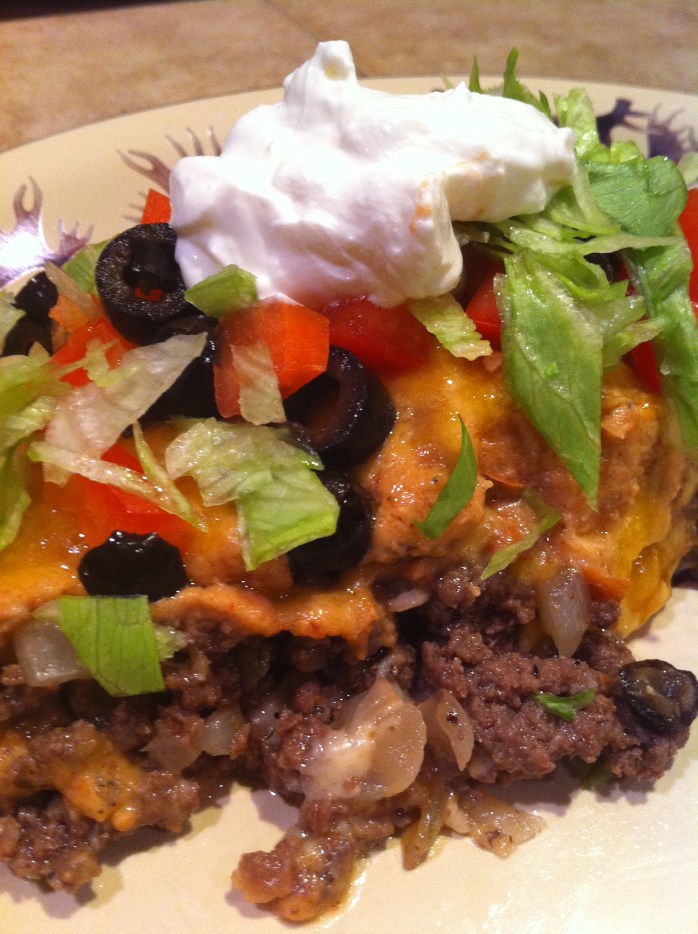 Sprinkle cheese over the mixture, and put in 350 degree oven for 30 minutes. While that is cooking start chopping and preparing your toppings. Once it is done, let it sit for about 5 minutes then put your desired toppings on top. I remove a piece and plate it then add the desired toppings. You can have your kids do that how they please, it is like a taco.