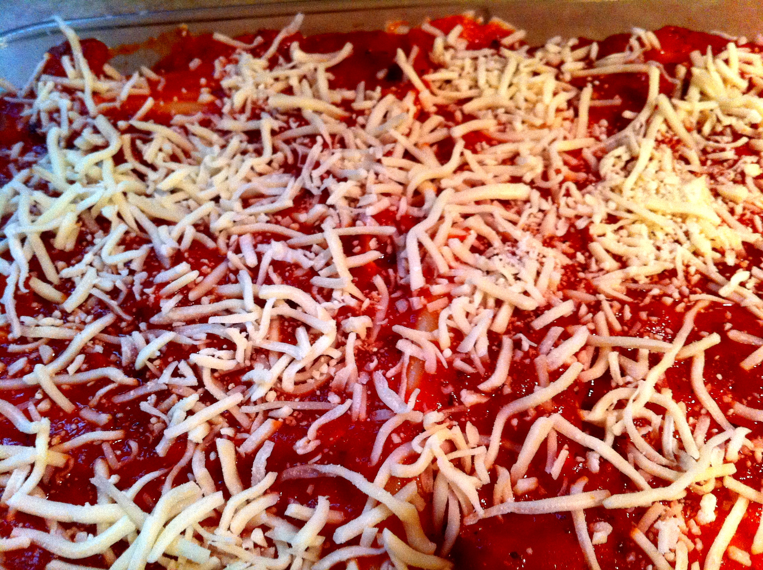 Okay, it is now time for the sauce. You can make your own, but I was on a time budget so I improvised with a jar of red sauce. I am partial to Rao’s marinara, but use who you prefer. Lay down a little cover fire on the 9 x 11 baking dish, by that I mean put a little on the bottom of the pan to lay your lasagna sheets on.