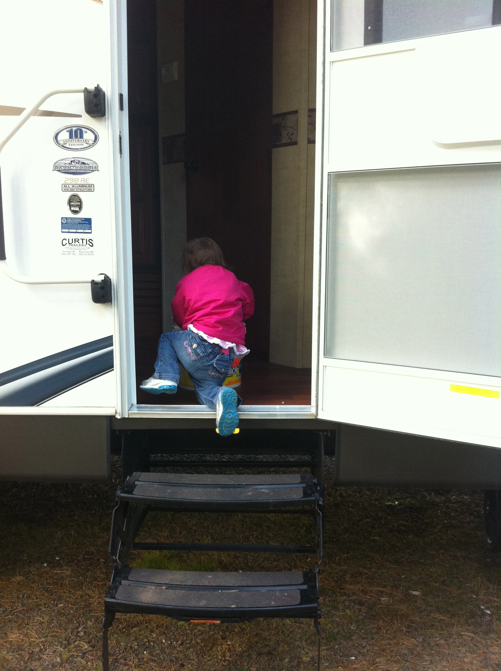 She then realizes that I am in hot pursuit and decides that she is going to take it into the RV for safety.