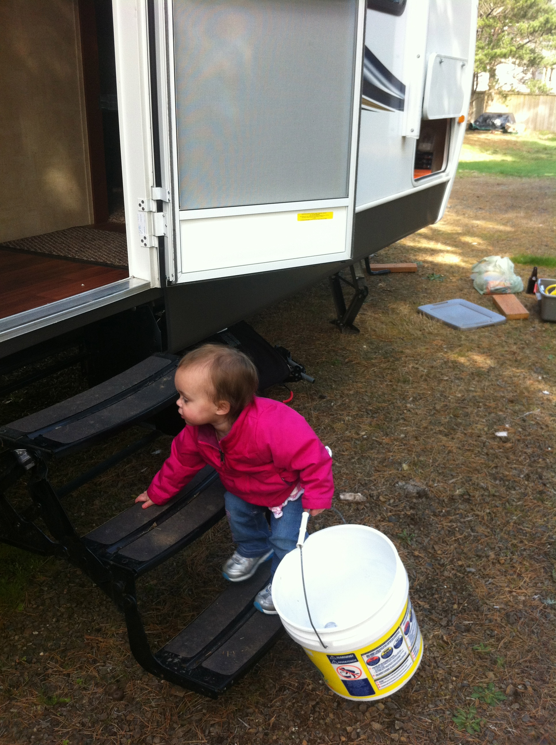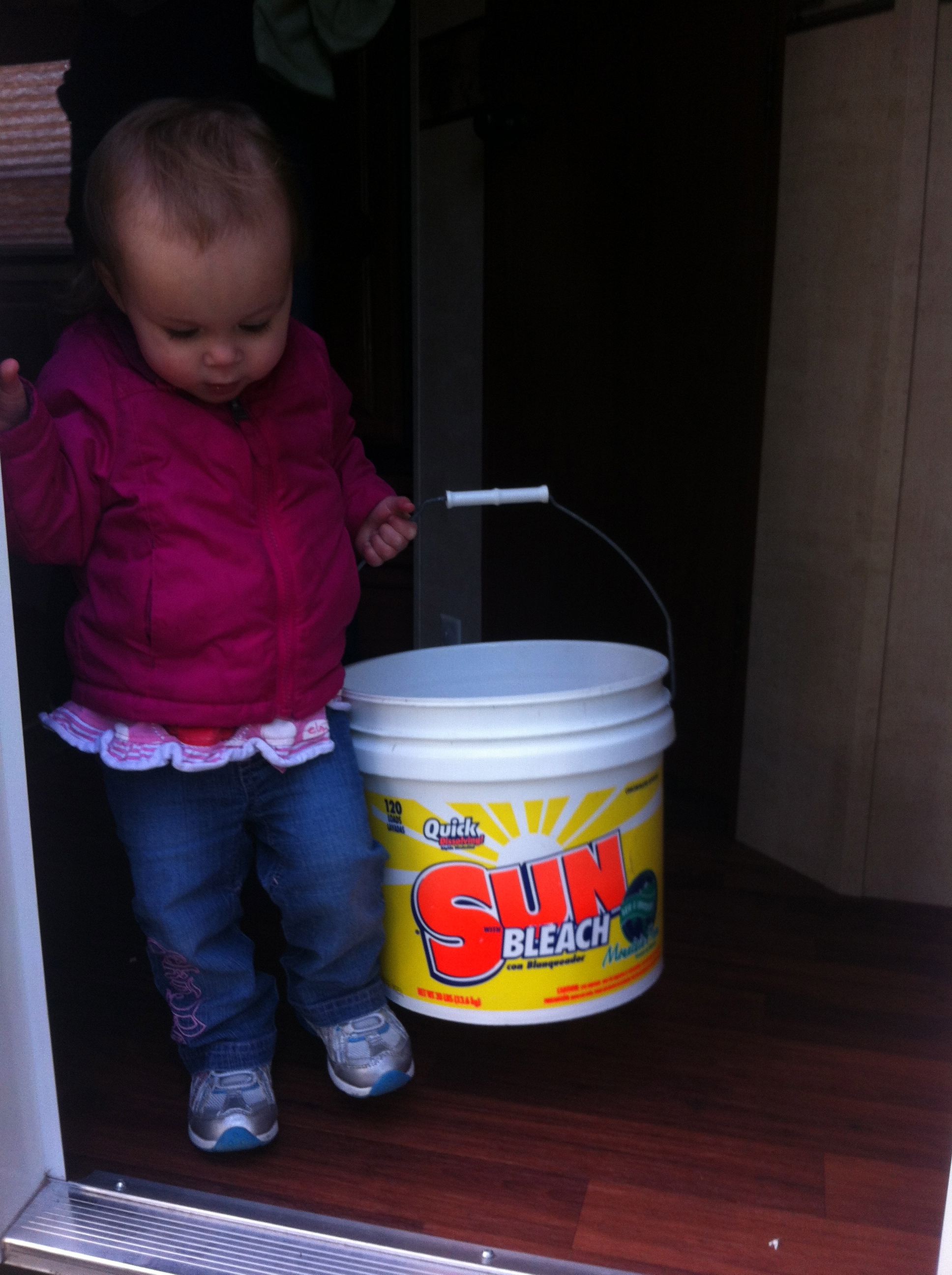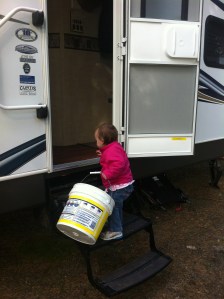Then she needs to pull the bucket into the RV once she has made it safely inside.