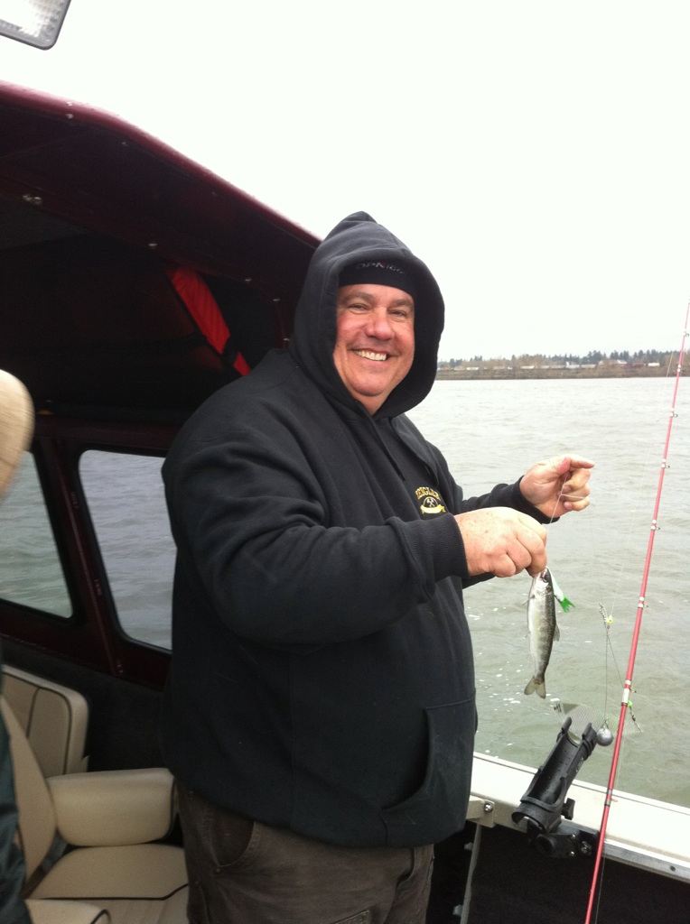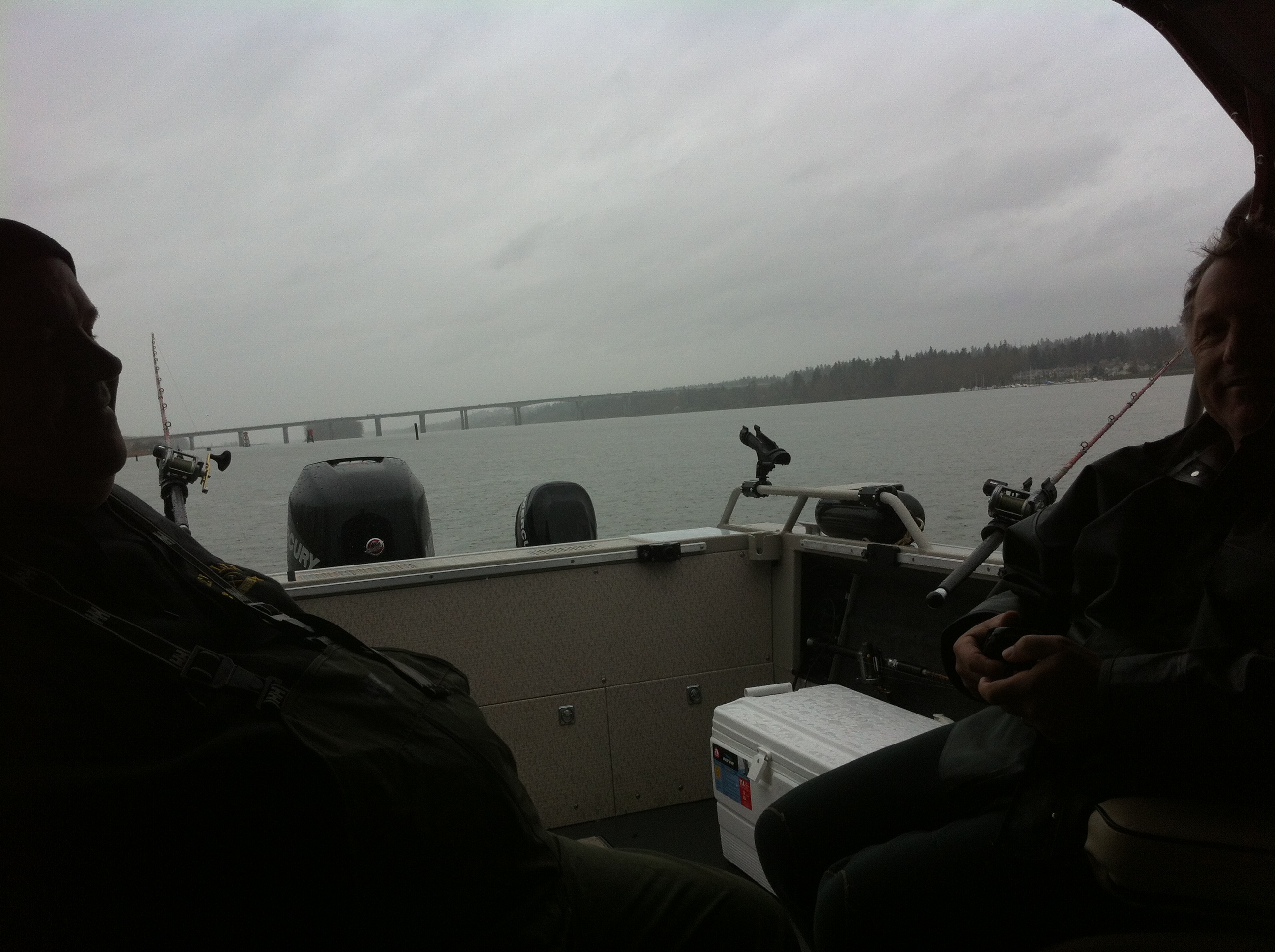 We must have put in a hundred miles trolling, and 400 herrings to the cause. In the Columbia the fish hold at the bottom so you drag a 10 oz lead, with a flasher with brined cut plug herring. We used green and blue, and blue seemed to produce better.
