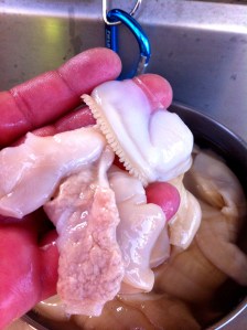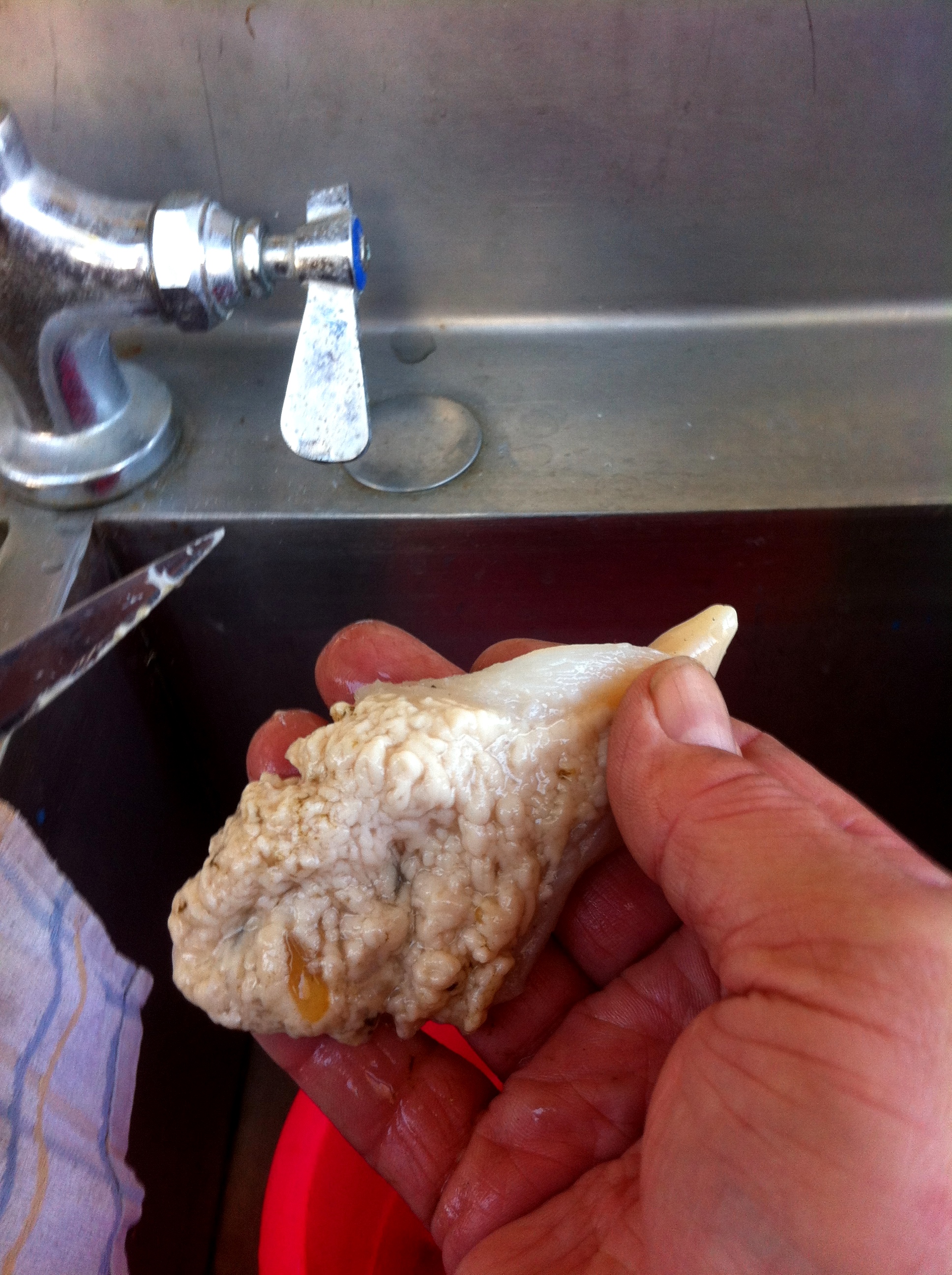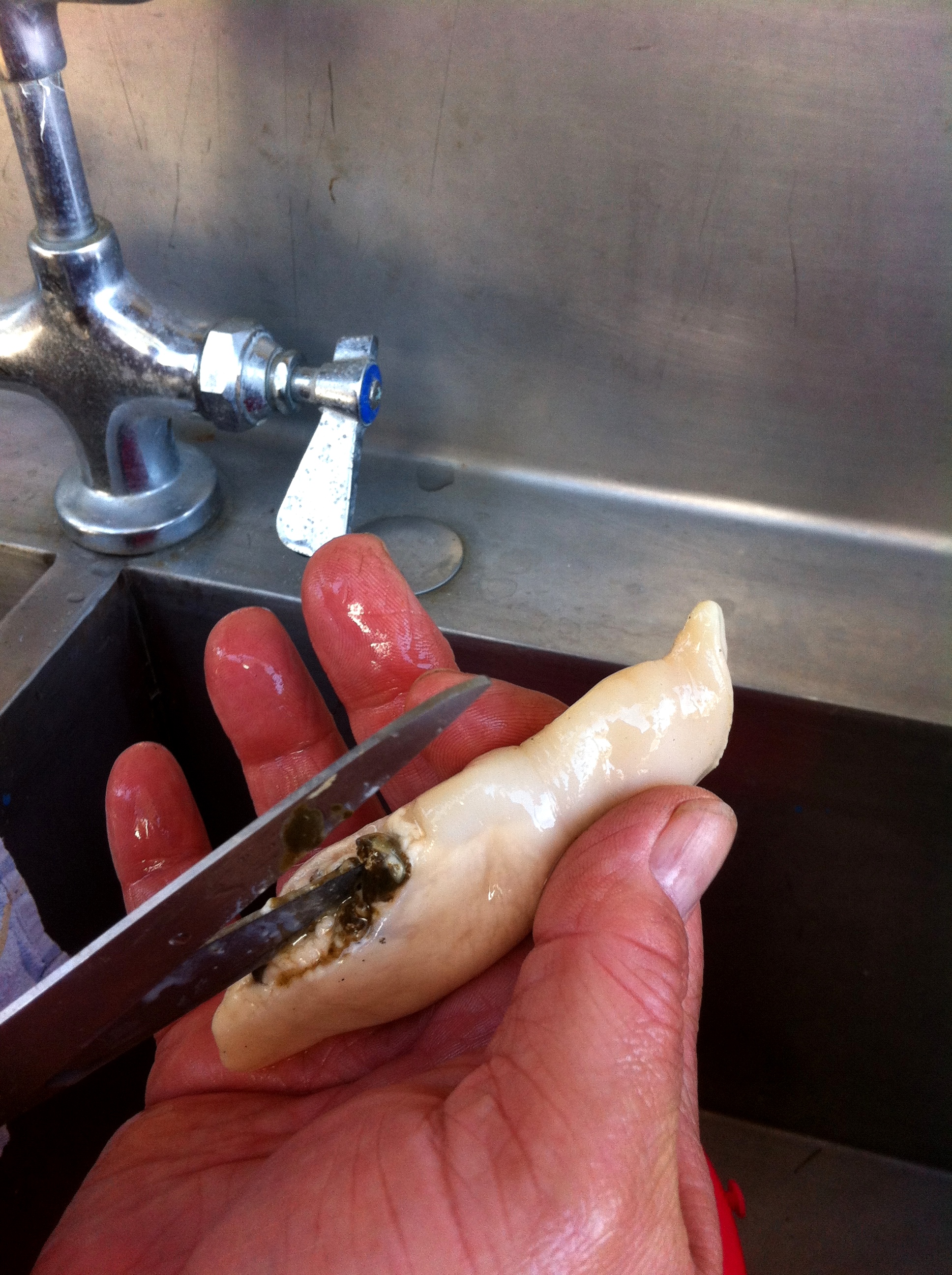 12. Make sure to lightly clean all the sand debris out of the foot, but leave the meat in tact. The butter substance in the foot is full of flavor. The foot itself is the delicacy of the entire razor and full of flavor with a very soft texture.