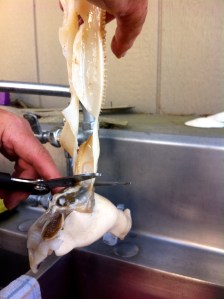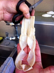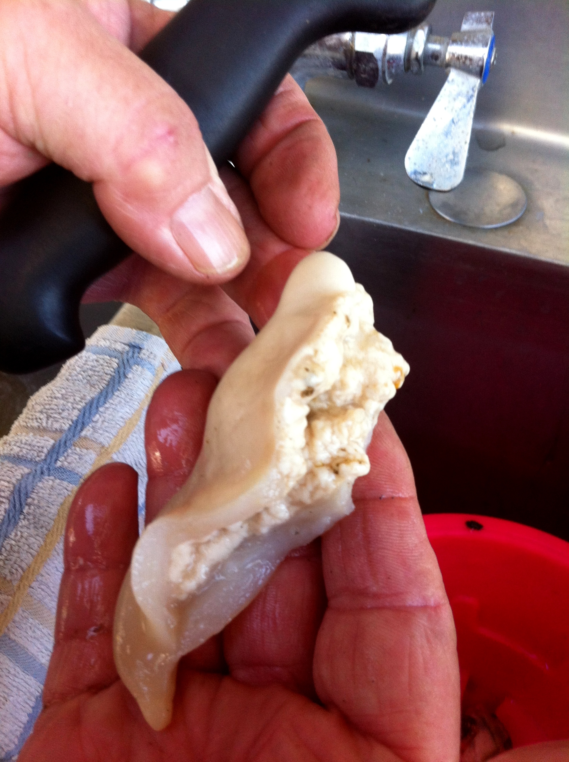 5. Holding the clam in the same position make two cuts on each side of the gills (they look like guts). This should be like an upside down V cut.