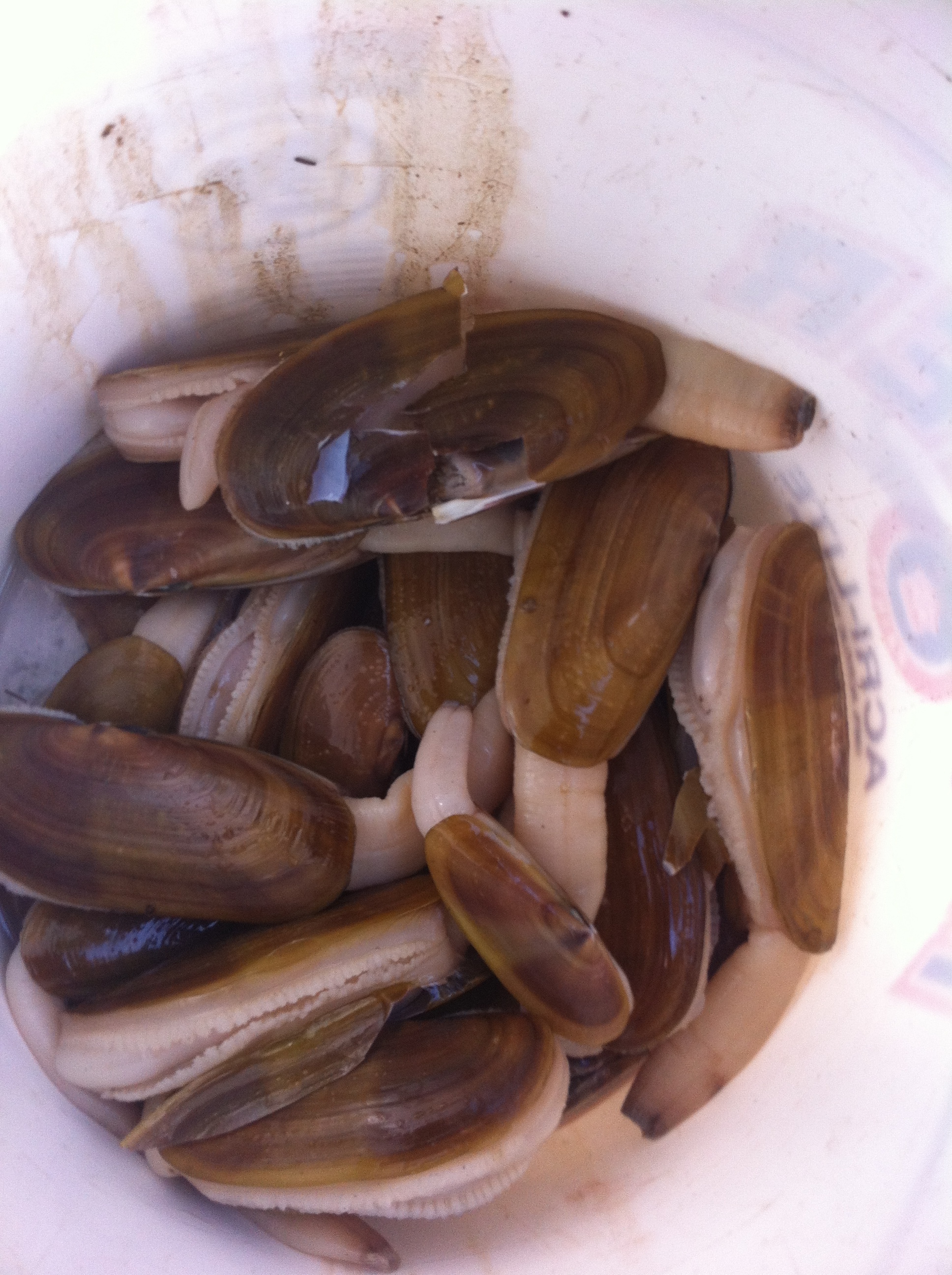 1. Put clams into a 5 gallon bucket and let soak for a few hours so they pump the sand out of the system.