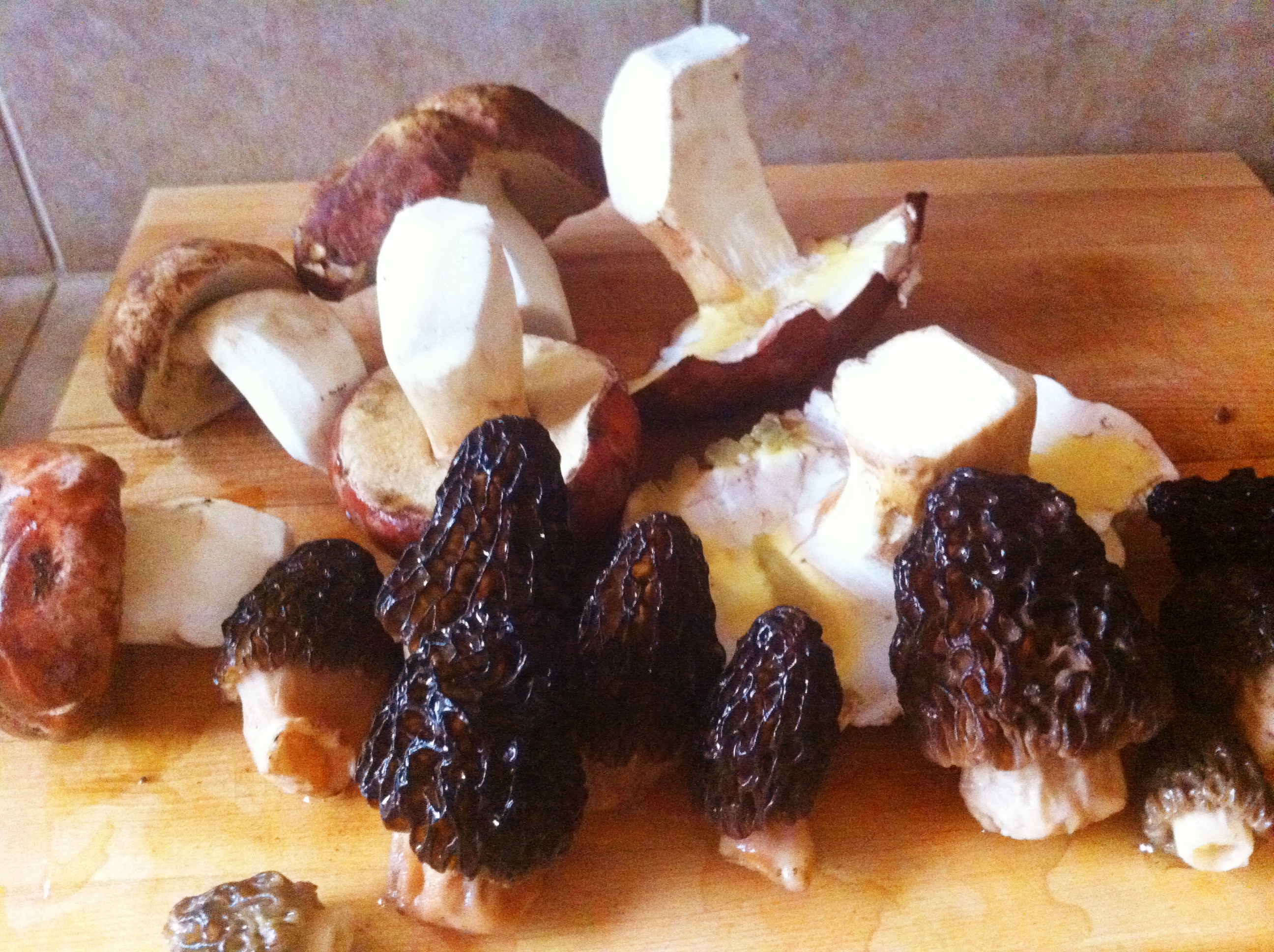 The morel mushrooms still have not shown in full force. The black ones have a little, the blondes at this point are a no-show and I fear that this year may be a bust. I started out by finding a few, yelling to my friend who only took the mental punches in the forest and went into a mental frenzy. I knew I had him when he went “Morel Mode” and started speed walking. He actually stepped over my largest find, which was the size of a football. I found 6 King Boletes today, and about 11 black morels.