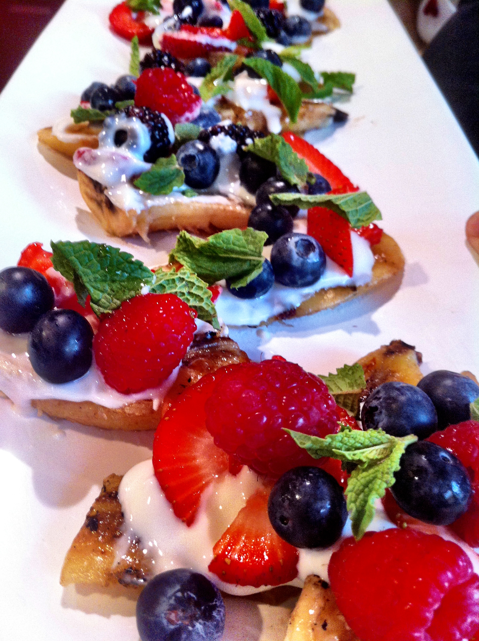 Take the banana out of the peels and plate them. Put a large dollop of the creme fraiche maple syrup mixture in the center of each banana half. Garnish with a the berries and mint.