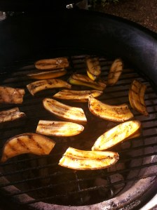 So I did this on the BGE (Big Green Egg). Brush the cut side of the bananas with oil. Grill on direct heat until golden brown, about 2 minutes on each side.