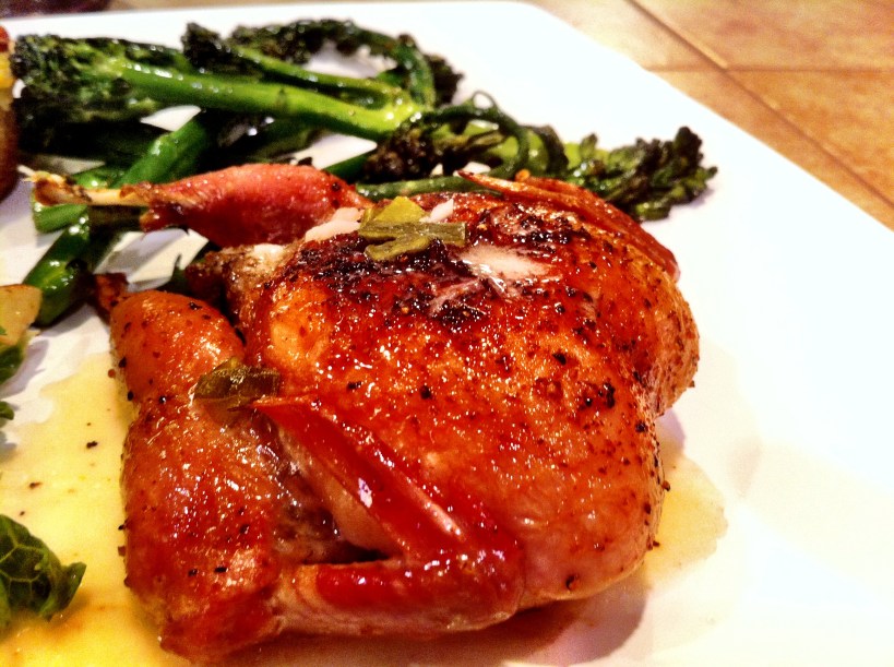 Then take a baking sheet or roasting pan and lay each bird breast side up, make sure to spray the pan with pam for easy removal later.