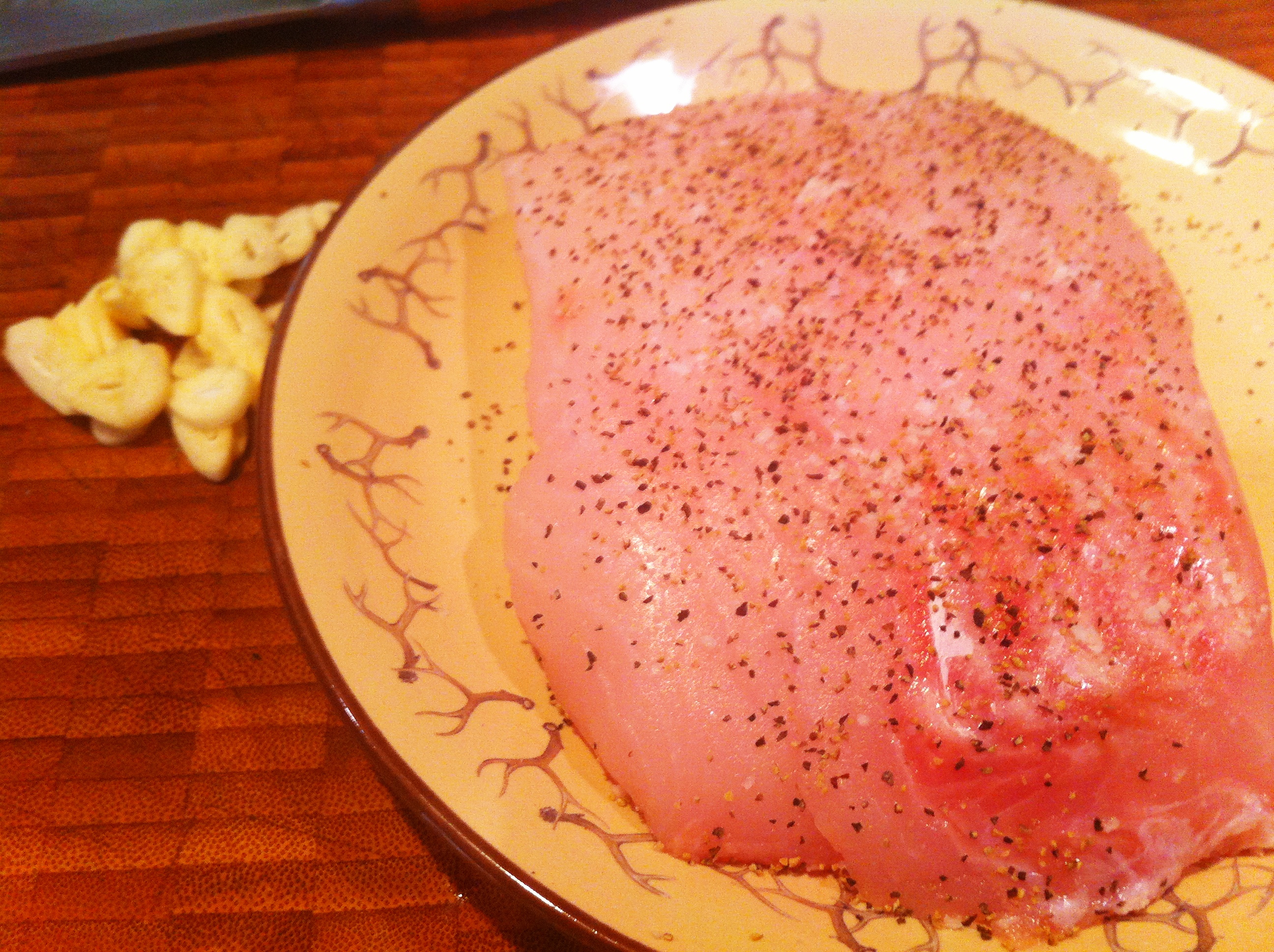 Flip the fish, and sprinkle the garlic around it, and cook until the garlic just starts to brown, about a 45 seconds to a minute.
