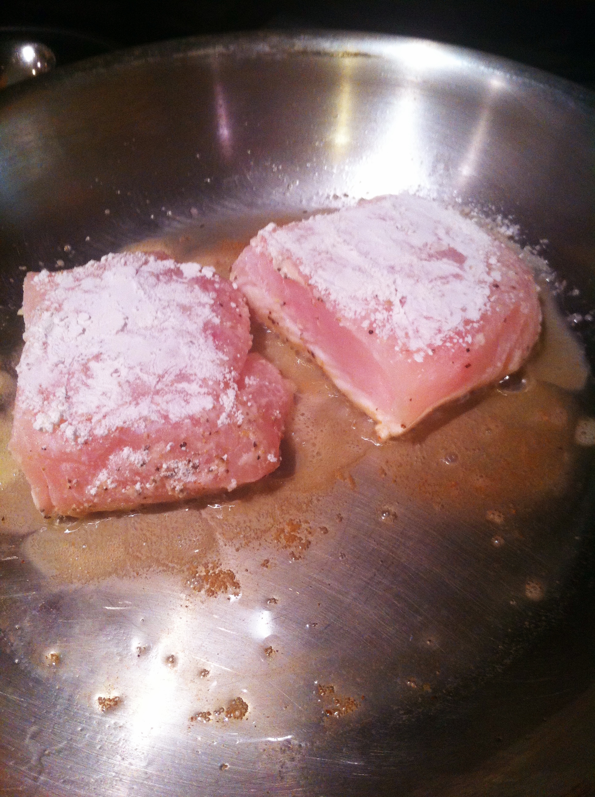 Dredge the fish in flour, and shake off any excess. Heat your oil in your pan on medium high to high heat until its shimmering hot then add your fish evenly spaced. Cook them without touching until it browns and releases easily from the pan, you can gently pick up the corners to look, about 3 minutes.