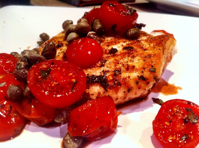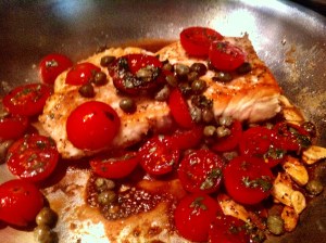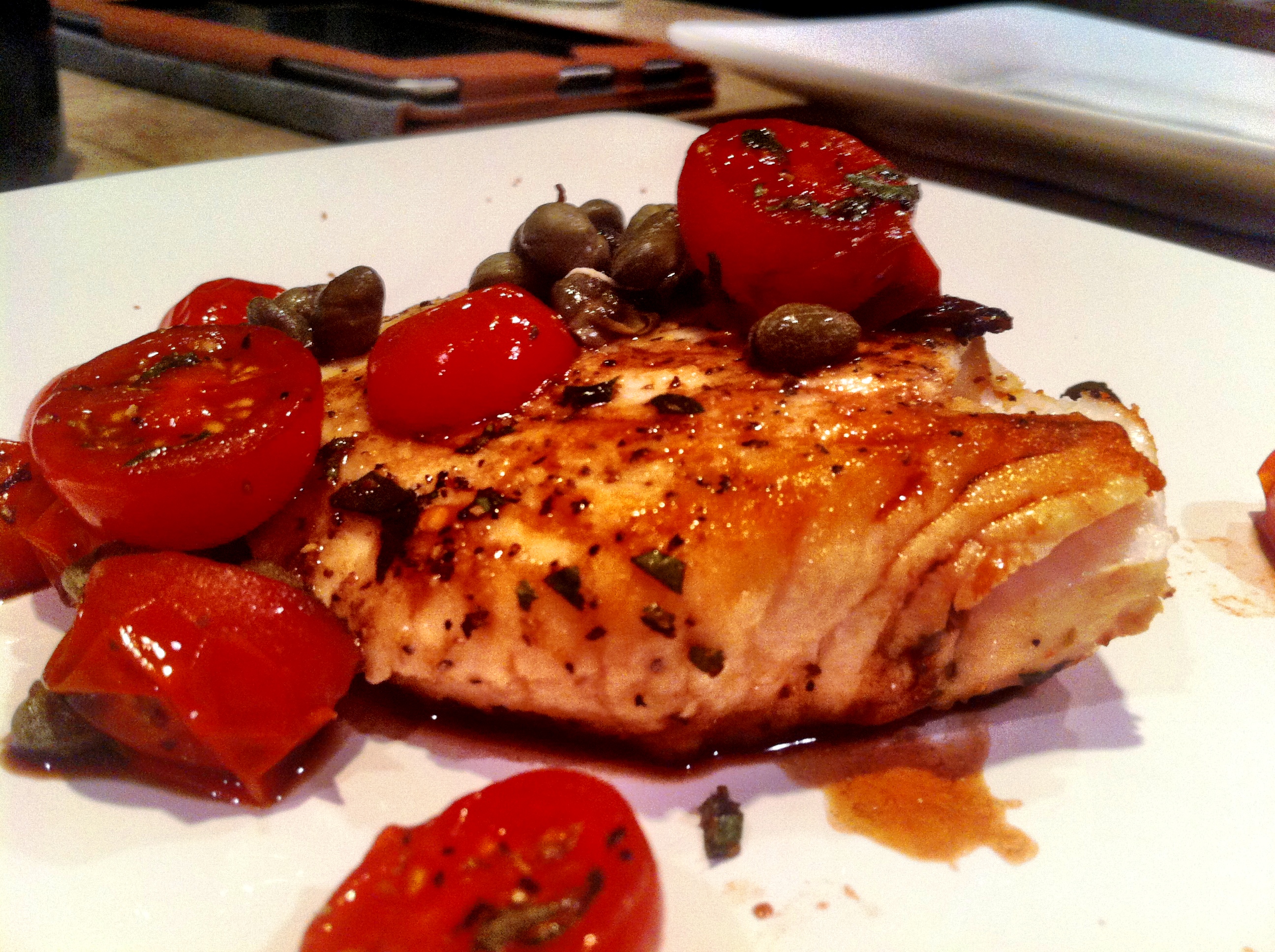 This is one of my favorite halibut dishes. However, if you do not like capers, do not make this dish. The capers, along with the balsamic vinegar and cherry tomatoes is what brings this dish and all the complexities together. If you have a cast iron dish you will take the searing to the next level. For all you outdoorsmen out there, this is how you impress your wife.
