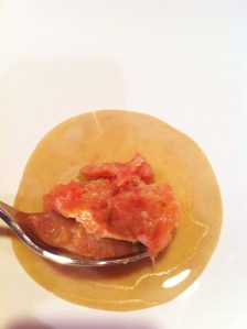 Then take one tablespoon of your filling and put it in the middle of the wrapper.