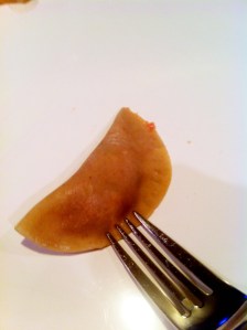 Then fold the dumpling gently together pressing the seams together. Leave a small opening at each end of the dumpling so gases can release. Make sure to gently press the dumpling slightly onto one side so the dumpling will cook evenly.