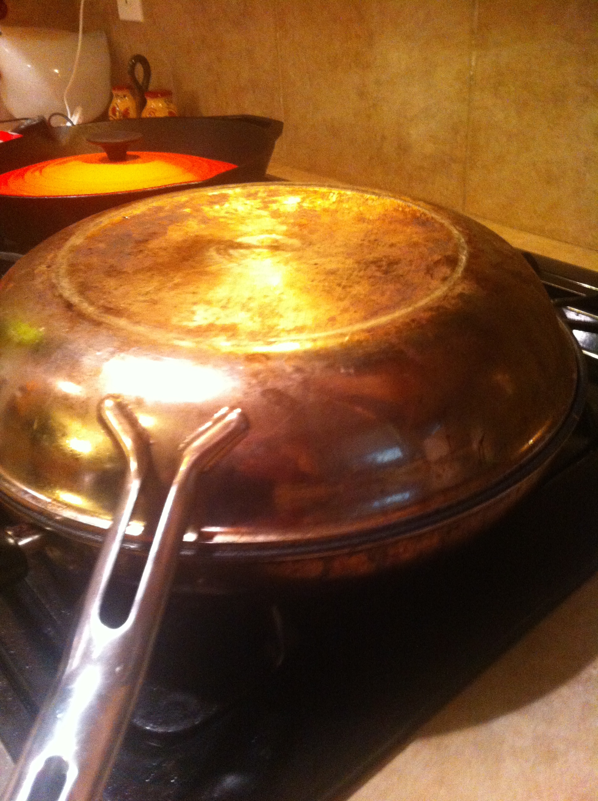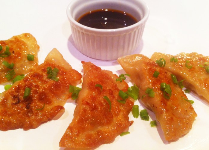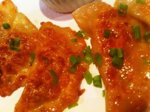 Heat the peanut oil in the non-stick skillet over medium heat until hot, then remove from heat and arrange dumplings in a tight circular pattern seam sides up in oil. Cook, uncovered, over medium heat until oil sizzles. Drizzle 1/3 cup of water over the pot stickers and cover for 8-10 minutes, I reduced my heat to low when I covered my pan. You never flip the pot stickers! Why they cook I cut up about two stocks of green onions and make the sauce.