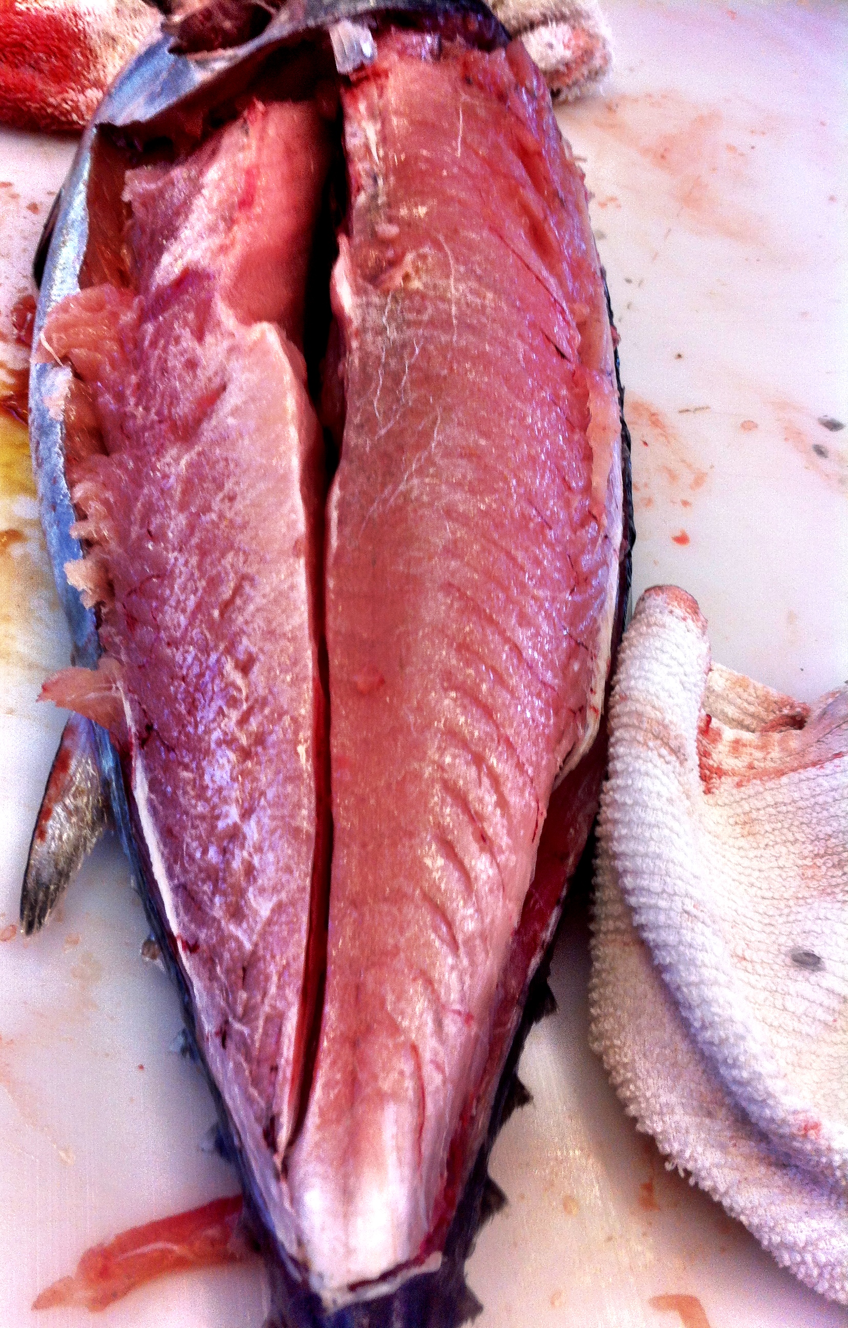 Do not wash your fish, you want to gently cut any blood colors or dark colors to the fish. Next tip, take a paper towel and clean your work station before the next fish so you do not get scales on your cleaned tuna loins.