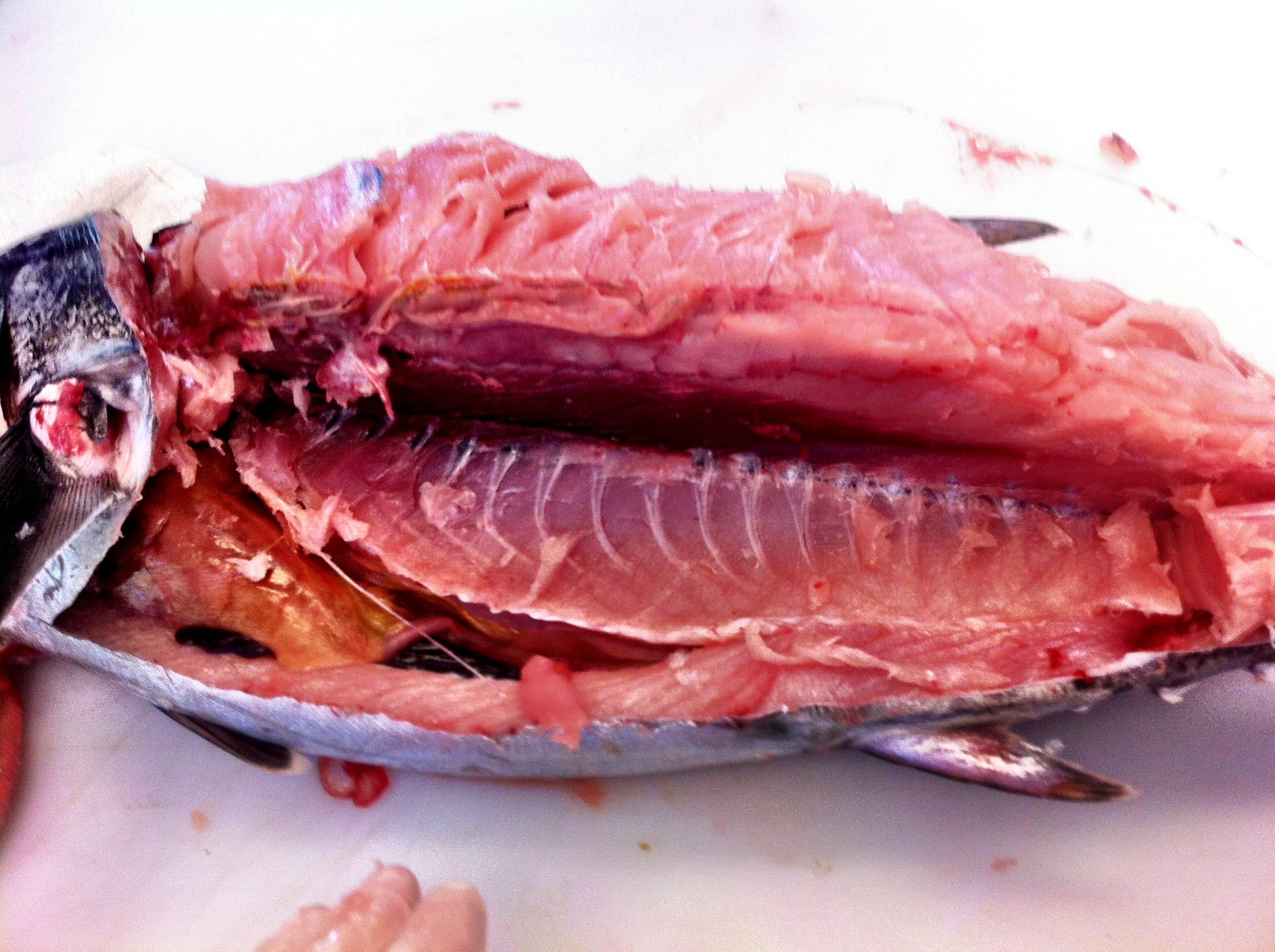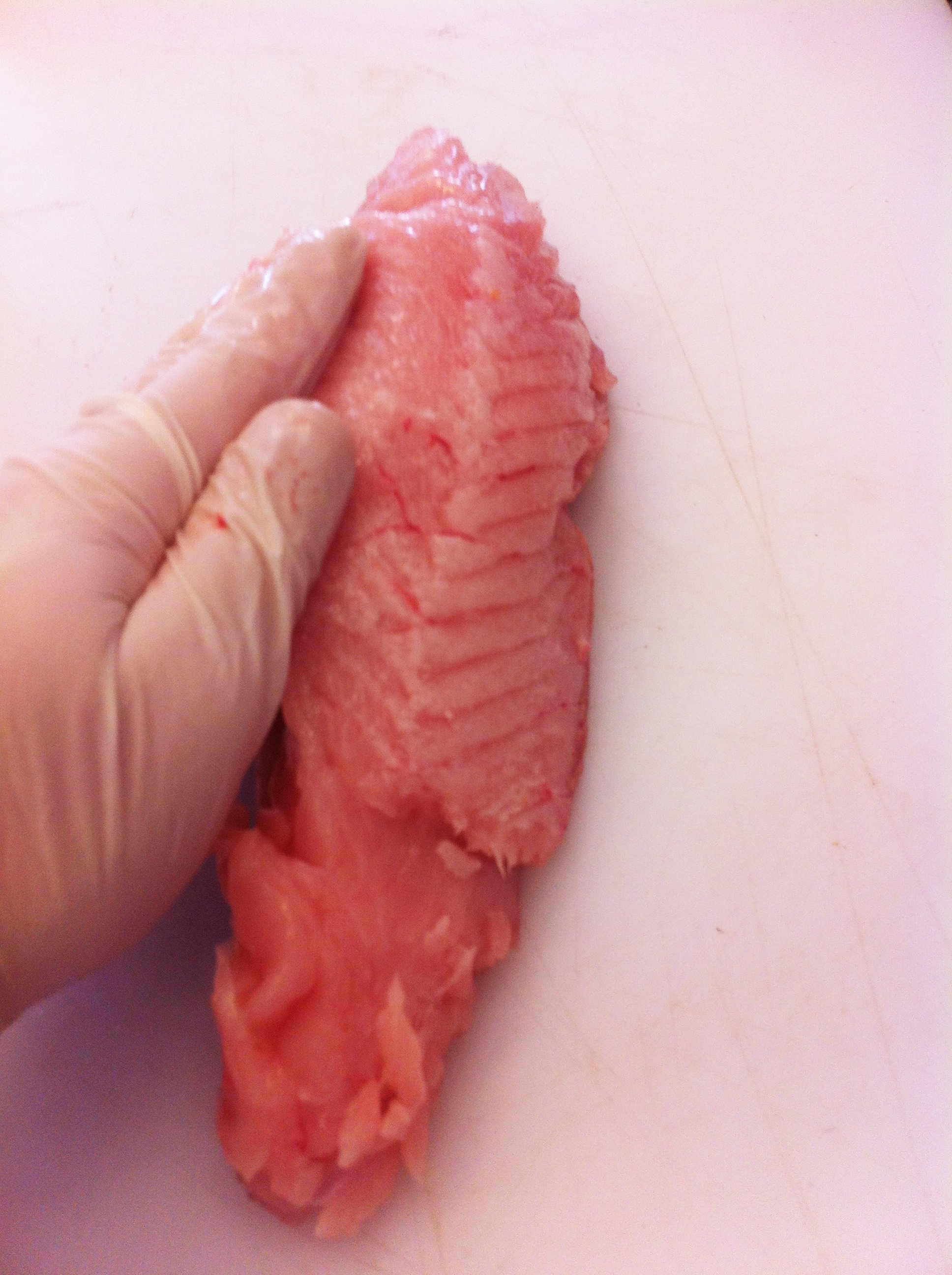 Then make a deep cut on the spin on the lower or upper end of the tenderloin, doesn’t matter which order. You can run your fingers down the spine to free the fish. NEVER RUN YOUR HAND UP towards the head because the spine bones will pierce your skin. Remove each tenderloin.