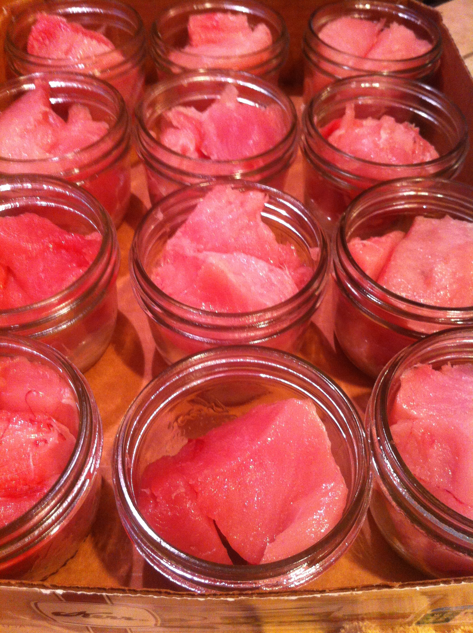 You can look to my past blogs on how to can tuna. That takes about 3 hours for every 24 cans you make. It is a long process. We also made some great meals with the tenderloin which is coming to the blog very soon. This is a long process of love and every year Grover and I look at each other like….why are we doing this? Truth be known, once you have your owned canned Tuna you will never touch store-bought again.