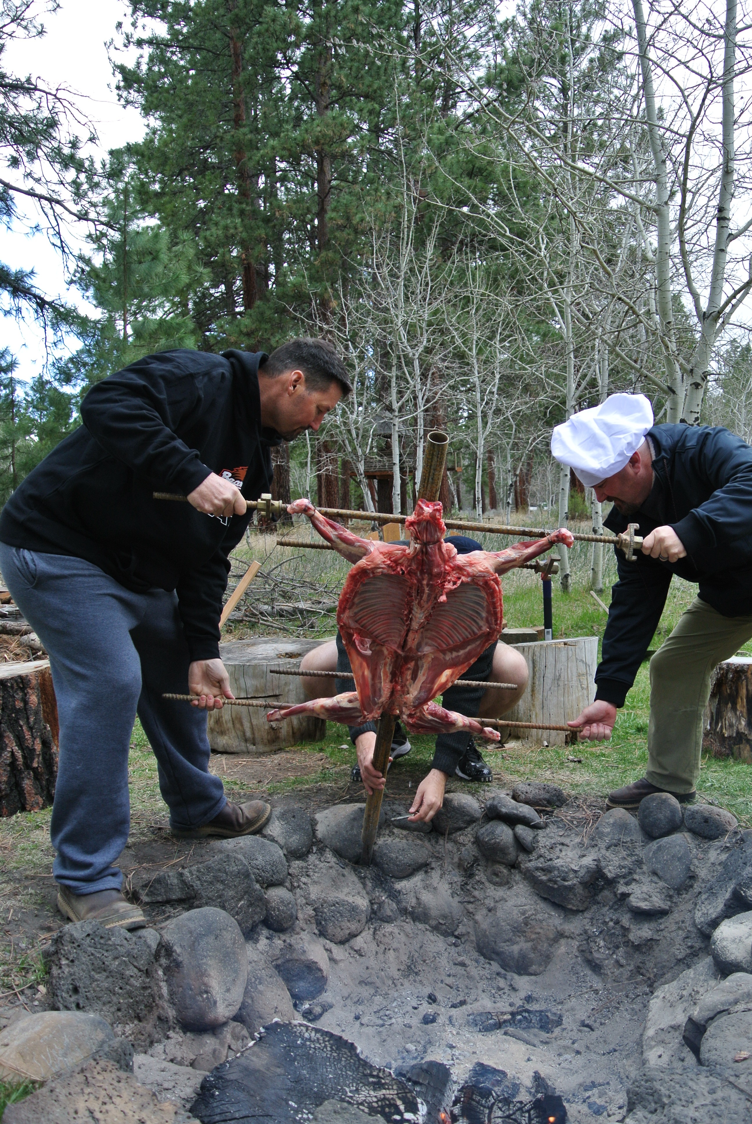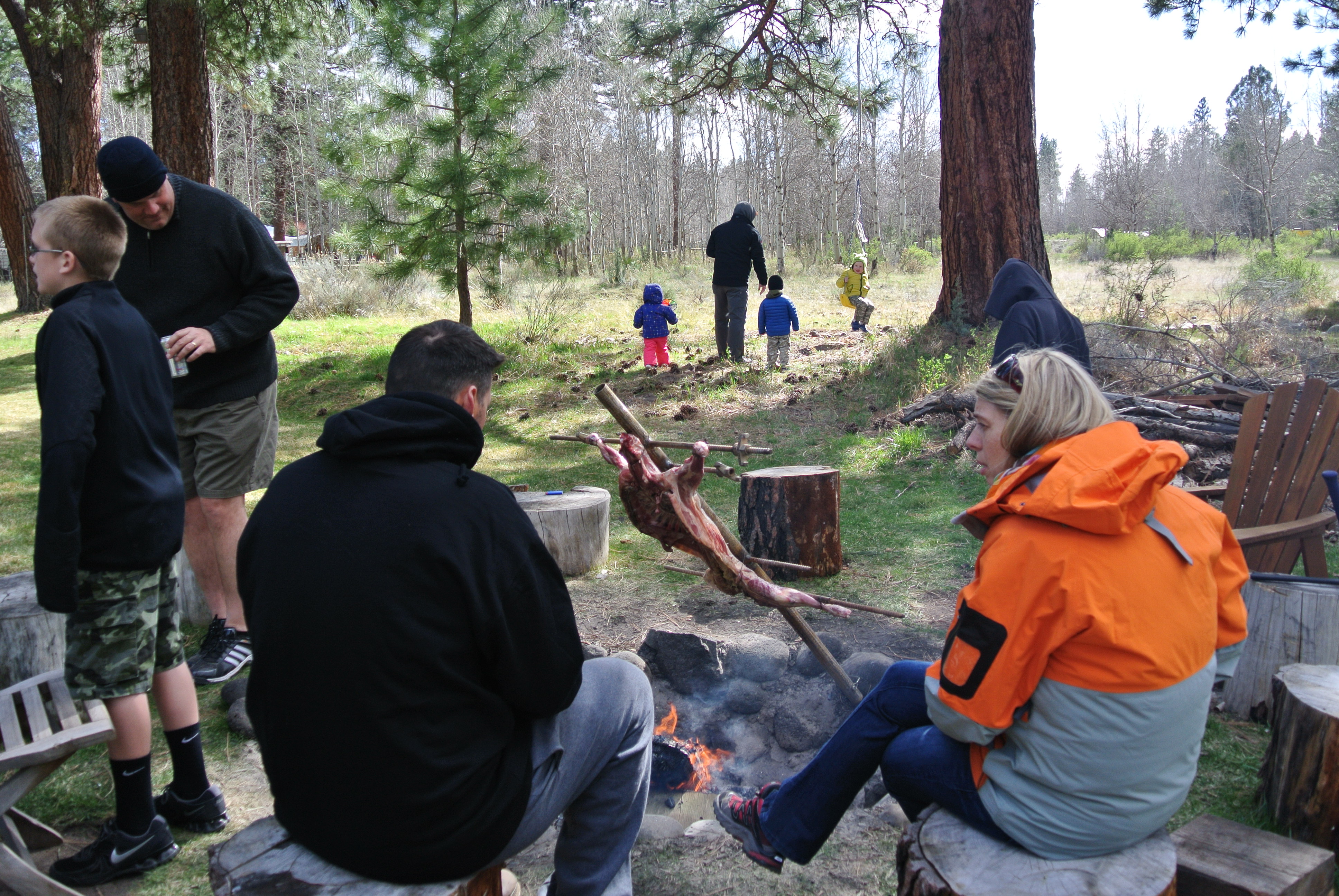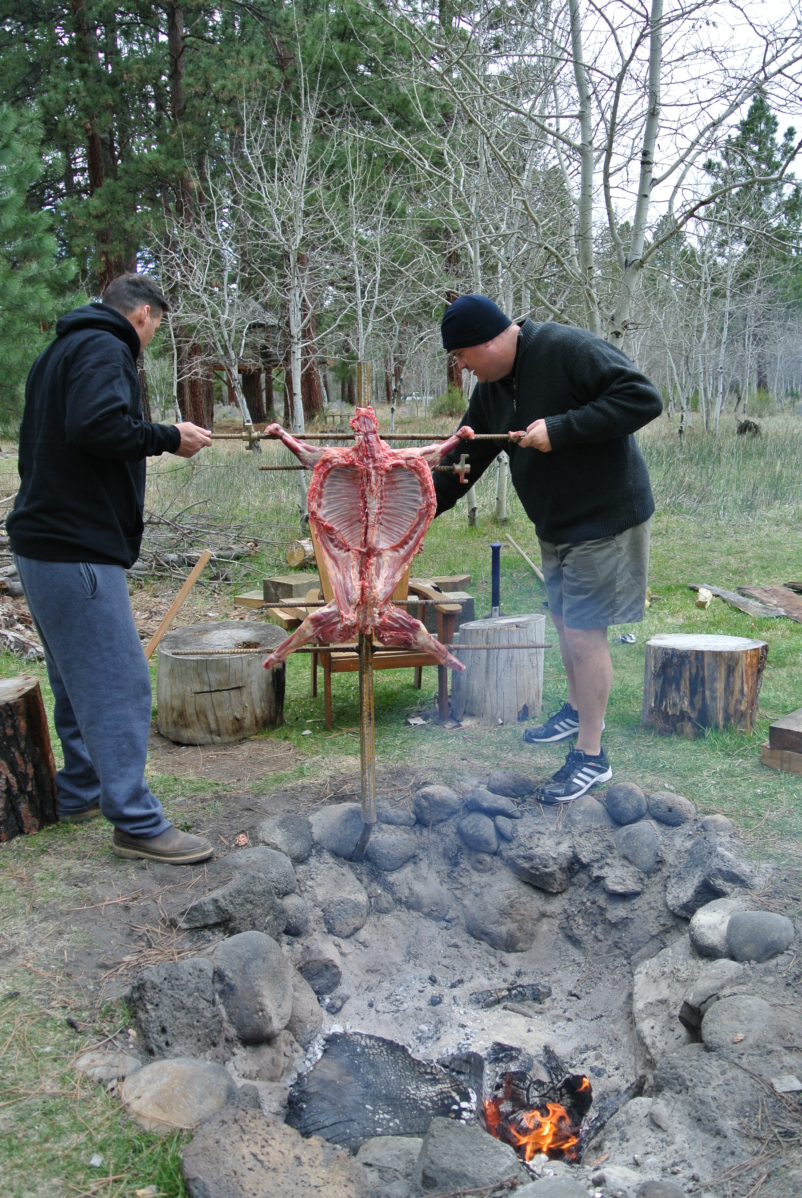 Wayne made a wonderful Lamb roasting spit for the fire. Basically the lamb is tied to the spit in the open fashion so it can cook evenly over the fire. This takes approximately 3 hours. We drive a stake into the ground at an angle and put it at the precise degree we need. Nobody fell into the fire.
