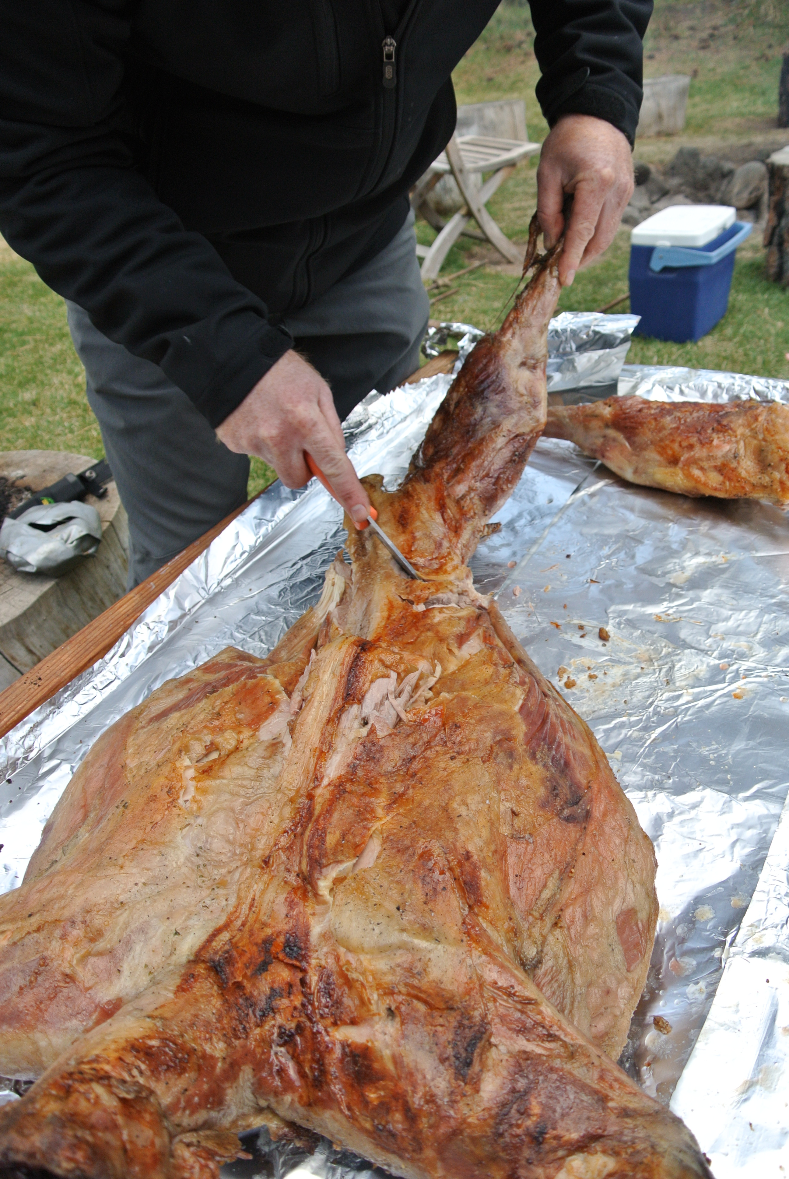 The lamb is putting off a very good smell. I am surprised that Grizzly bears have not snuck into camp. We turn it around every so often and took our meat temperature gauge to assure a smooth even cooked lamb.