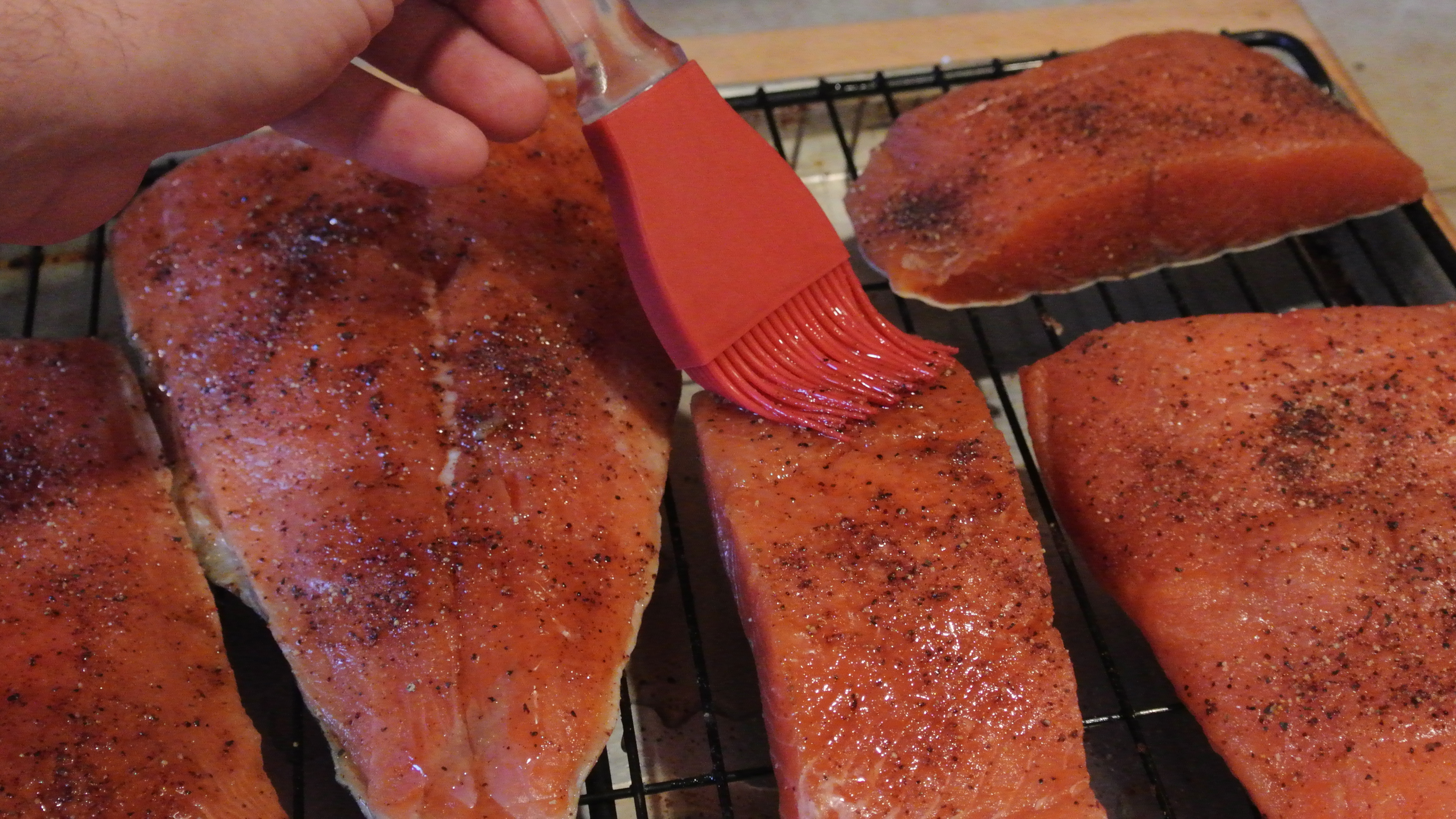 The first thing that you need to do is brine the salmon. There are dry brines and wet brines. I choose to do the wet brine because I think it remains more moist, but that is my personal opinion.
