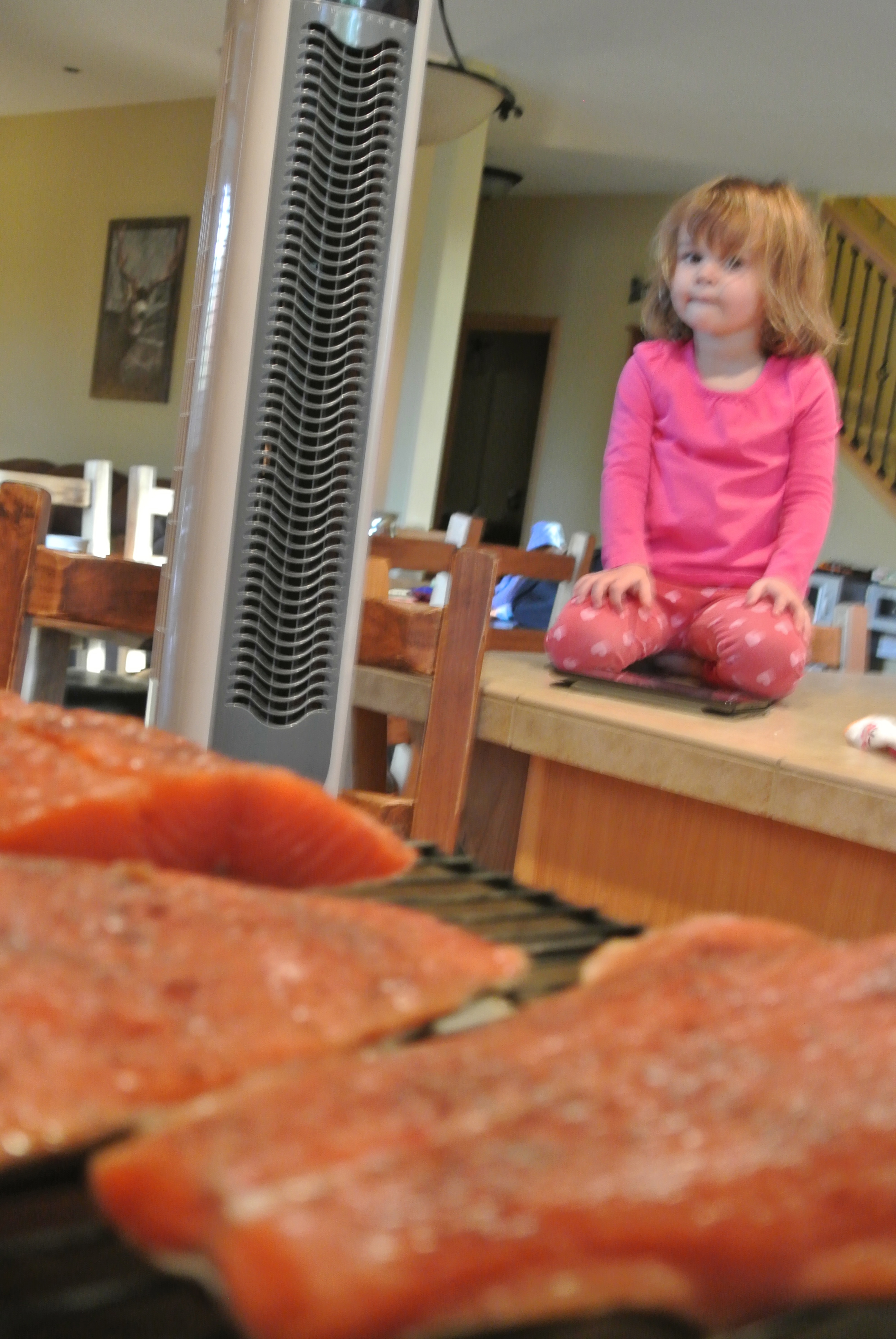 The fan is going to circulate air, you want the salmon to set and get firm so there is no liquid or wetness to the fish. This seals the salmon from leaking oils later in the smoker. I will show you later.