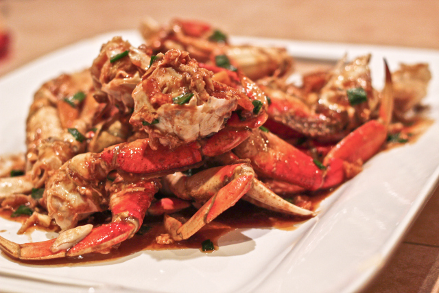 Remove the crab dish from the wok by pouring it onto serving platter. Pour remainder sauce over the crab.