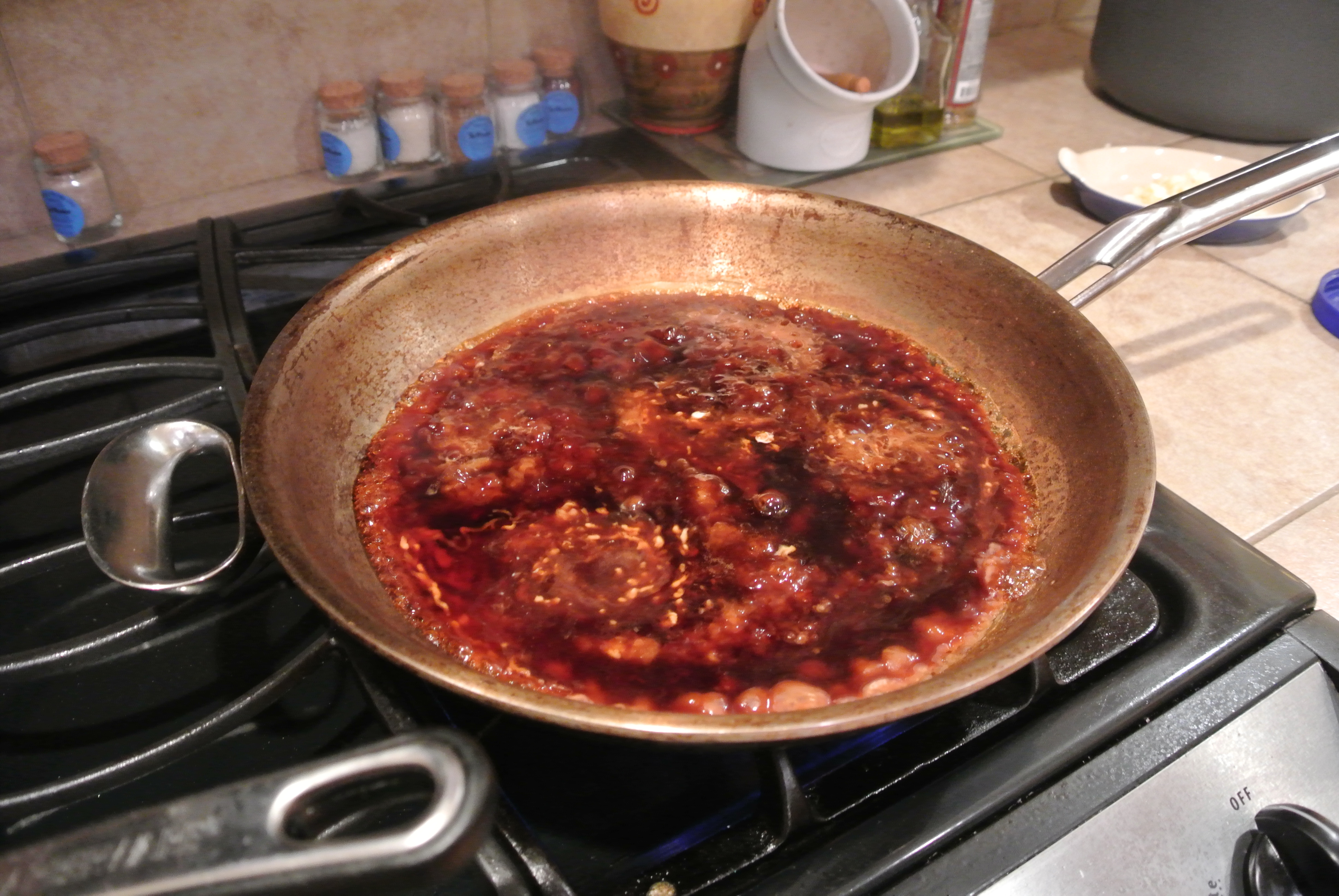 Steam the bok choy for five minutes or until done. While steaming the vegetable get a saute pan and add oil and garlic. Get a nice brown on the garlic and add soy, sugar, starch and water.