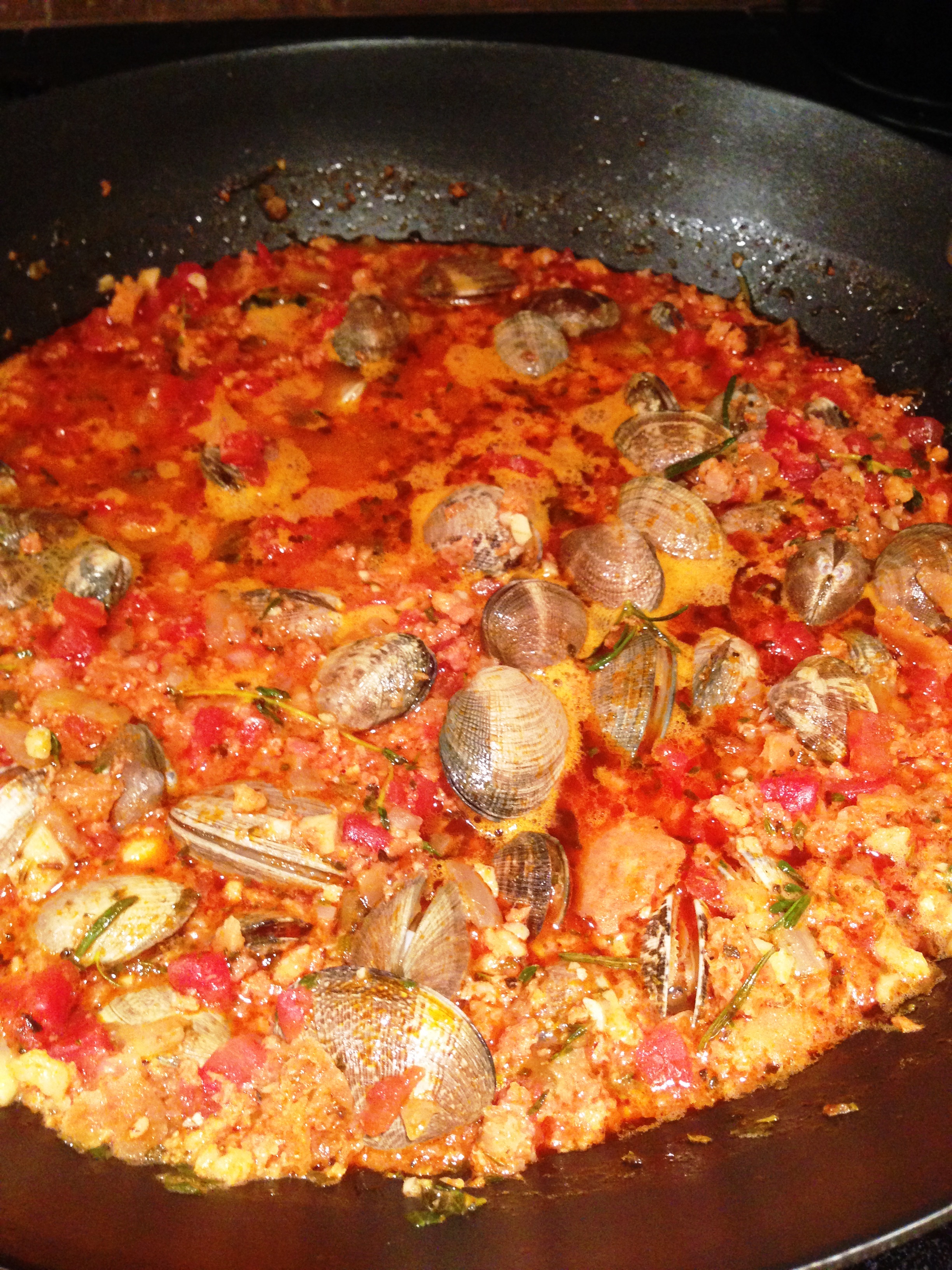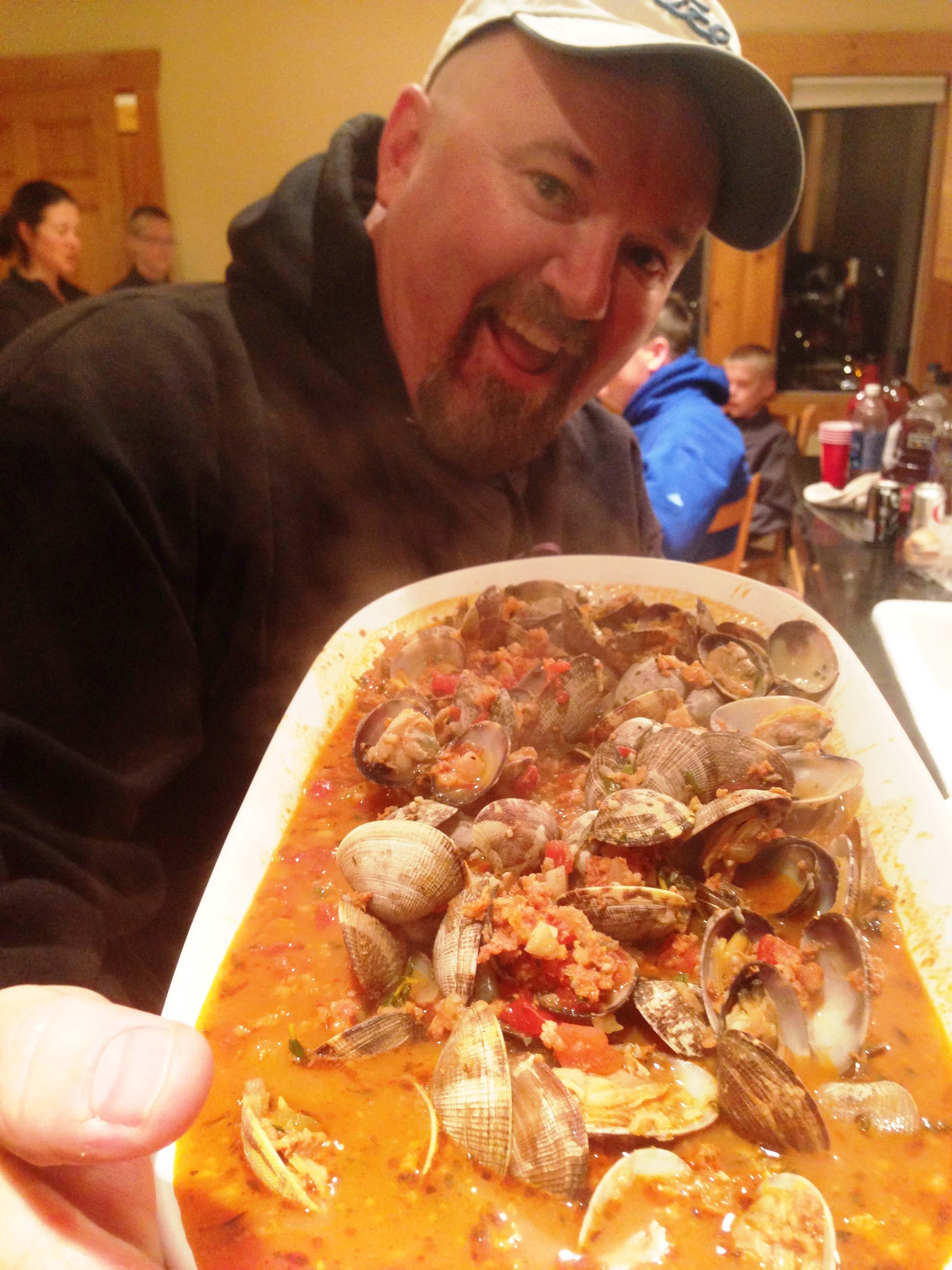 I just recently celebrated my 45th birthday. For those of you that do not know me, on my birthday I like to give back and celebrate by cooking for a group of friends some where special. This year, as it was last year, we did this in Sisters, Oregon. One of the days was going to be Seafood Extravaganza. So I brought up some fresh seafood and we hit the kitchen. First up was this dish, and it was spectacular. Todd brought about 20 pounds of chorizo for his stuffed mushrooms (which was 19.5 lbs too much) so I said to myself, grab some of that and add it to this dish!