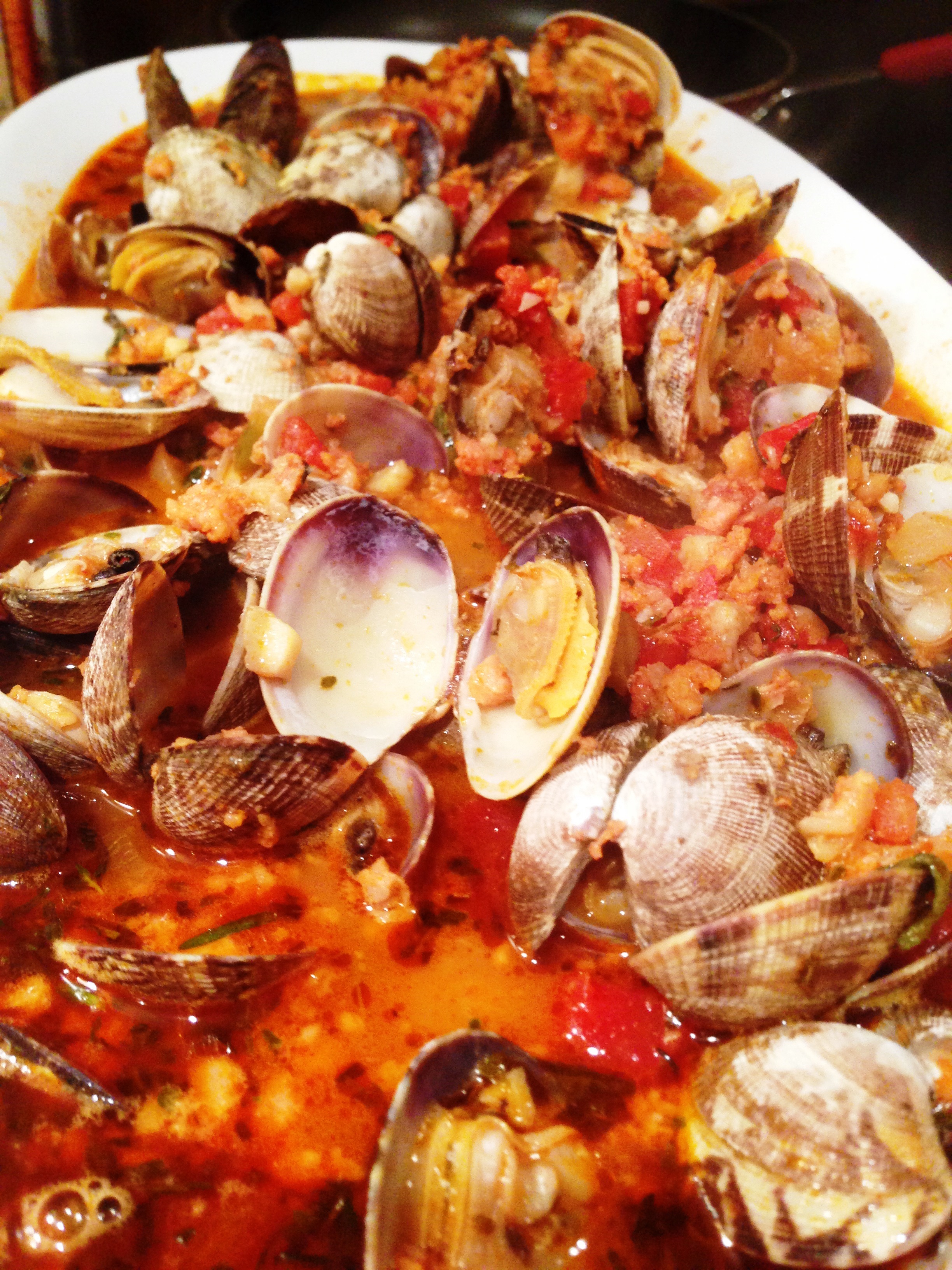 Cover and cook for five minutes, remember to discard any clam that does not open. Then also to remember to turn around with a slotted wooden spoon and fend off any black ninjas trying to get to your clam dish.