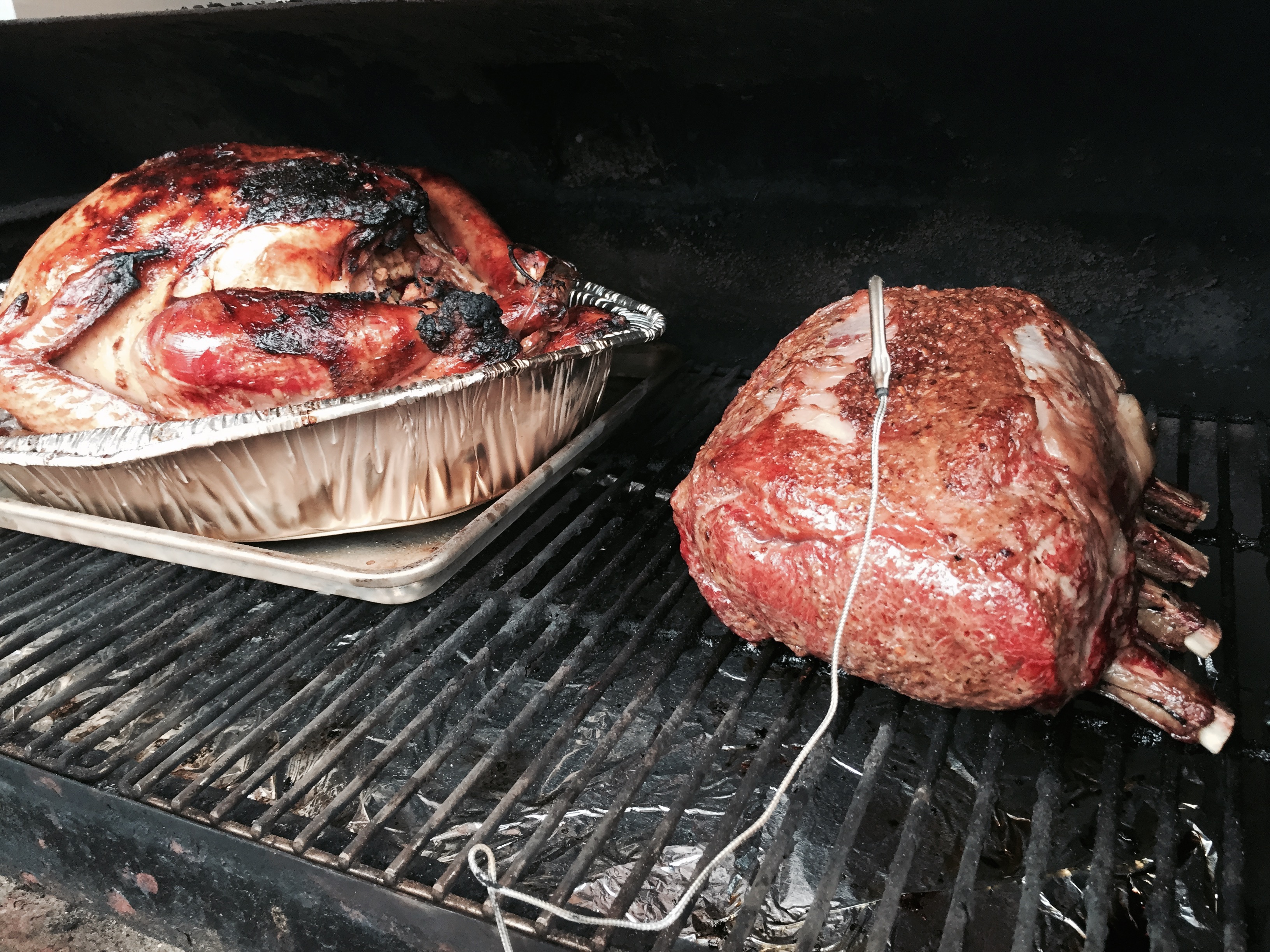 I use a Traeger pellet smoker for this, so I bring the heat up to 350 degrees then down to 220. Set your marinade prime rib in the smoker with your temperature gauge into the thickets piece.