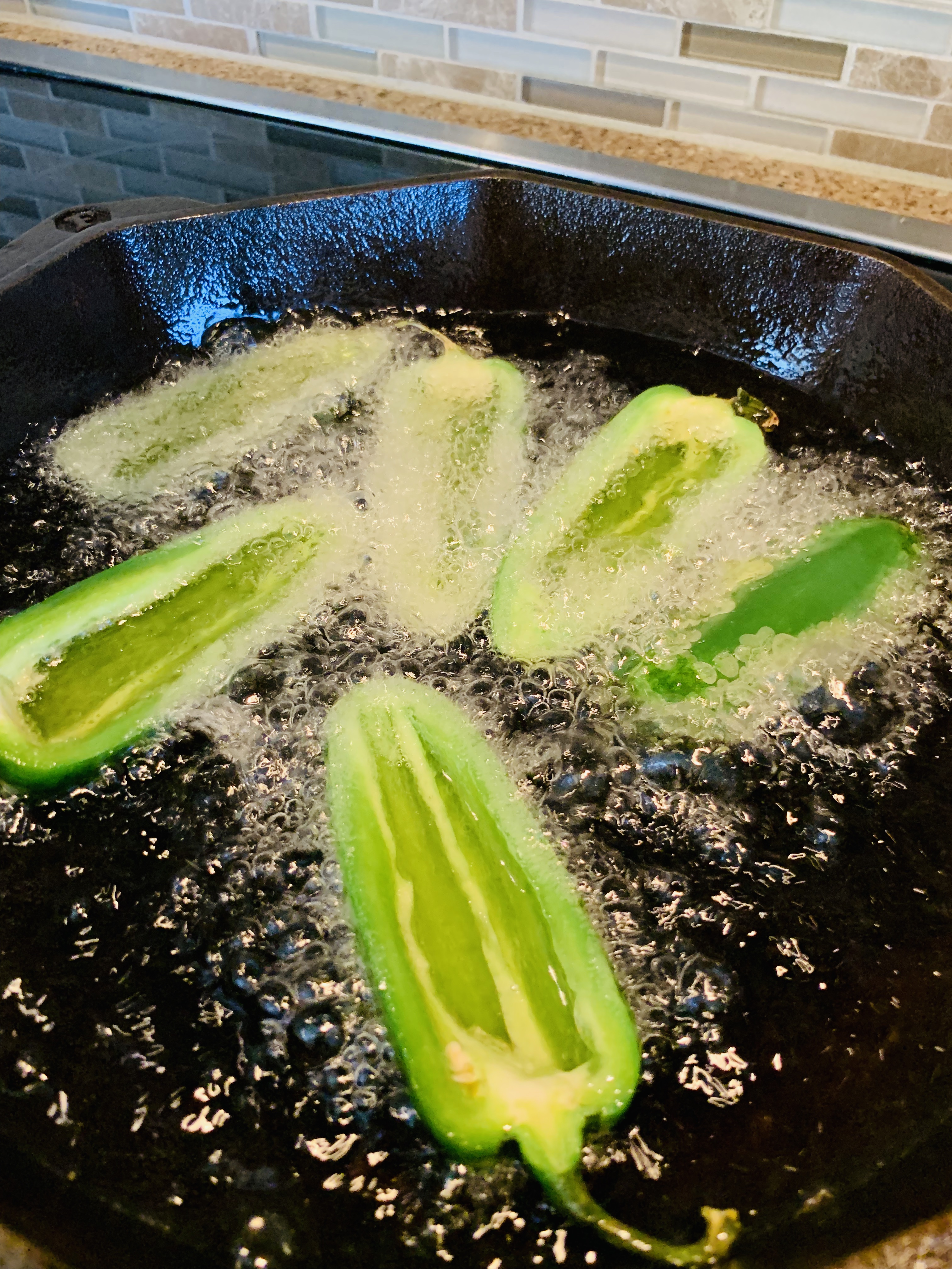 Bring vegetable oil in a high heat in cast iron pan, or something deep dish. Add jalapenos for 3 minutes.