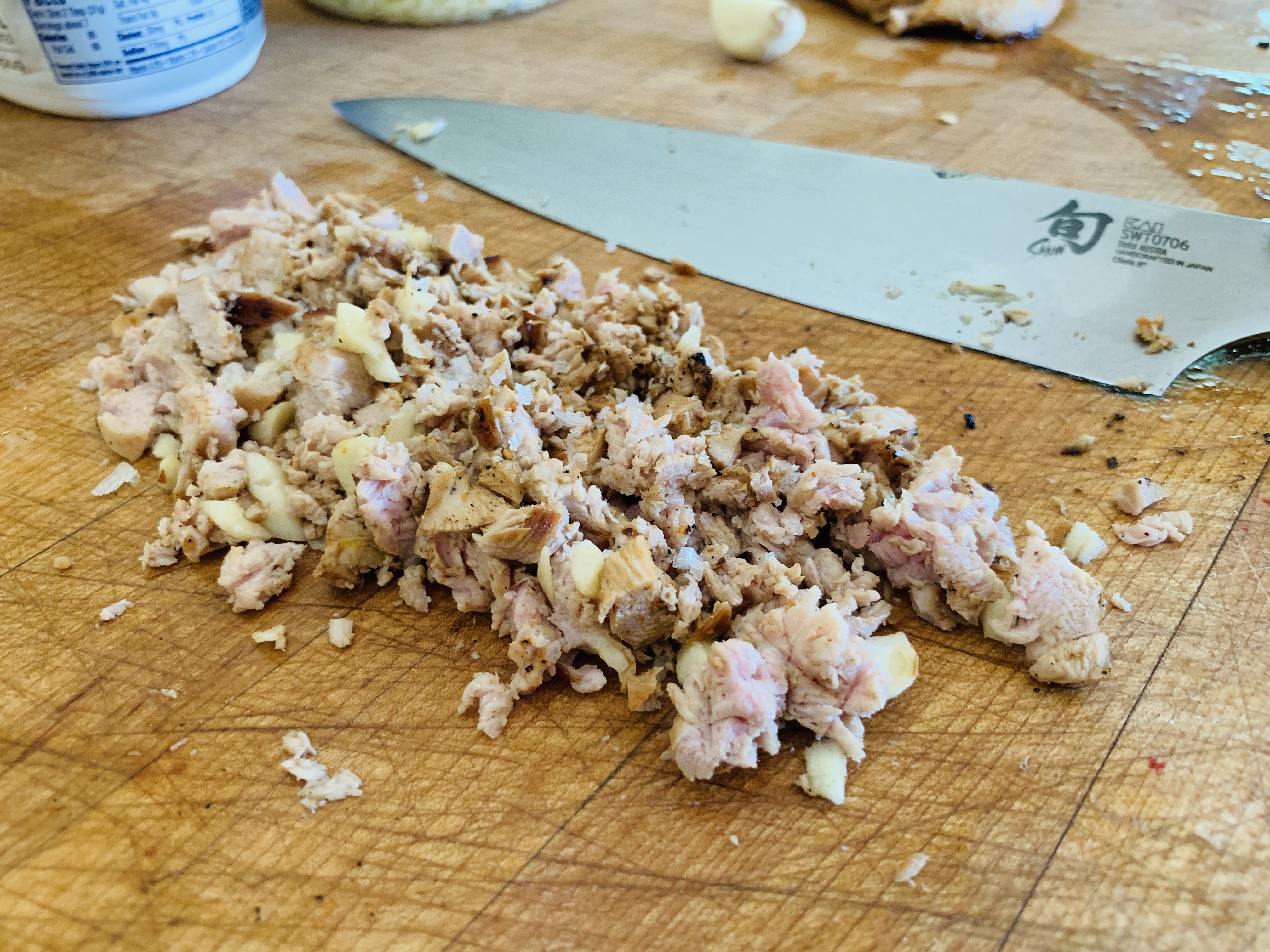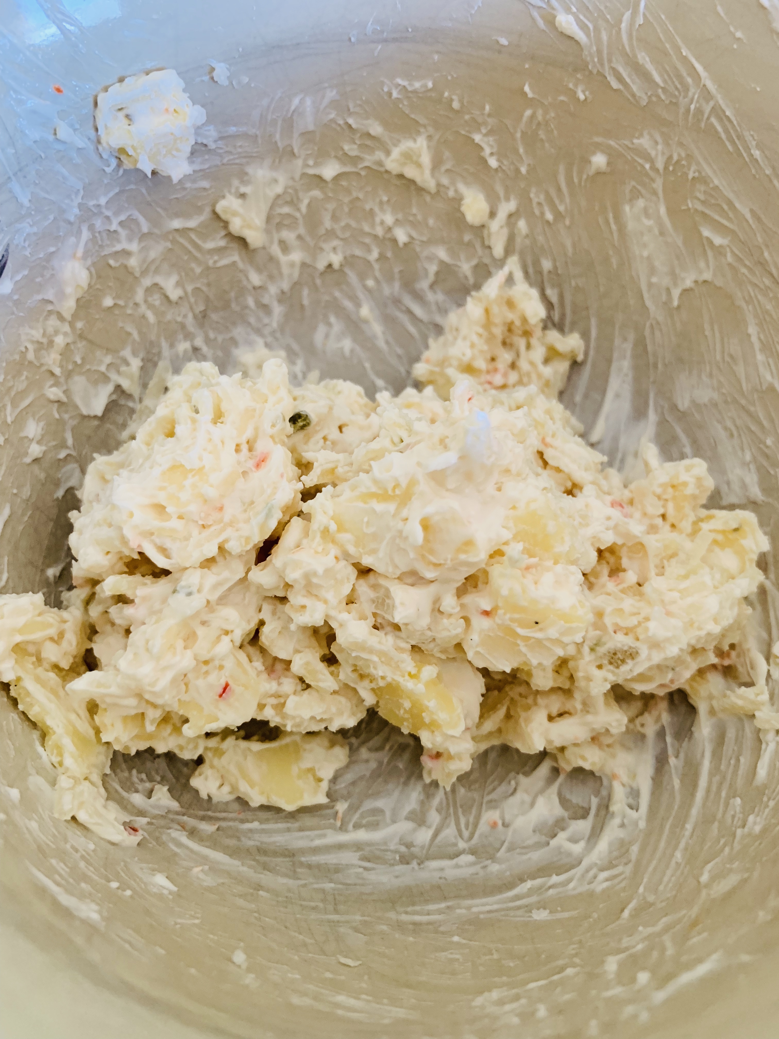 Mix vegetable cream chesse, Parmesan, Colby jack, and chopped garlic to bowl and mix. Set aside.
