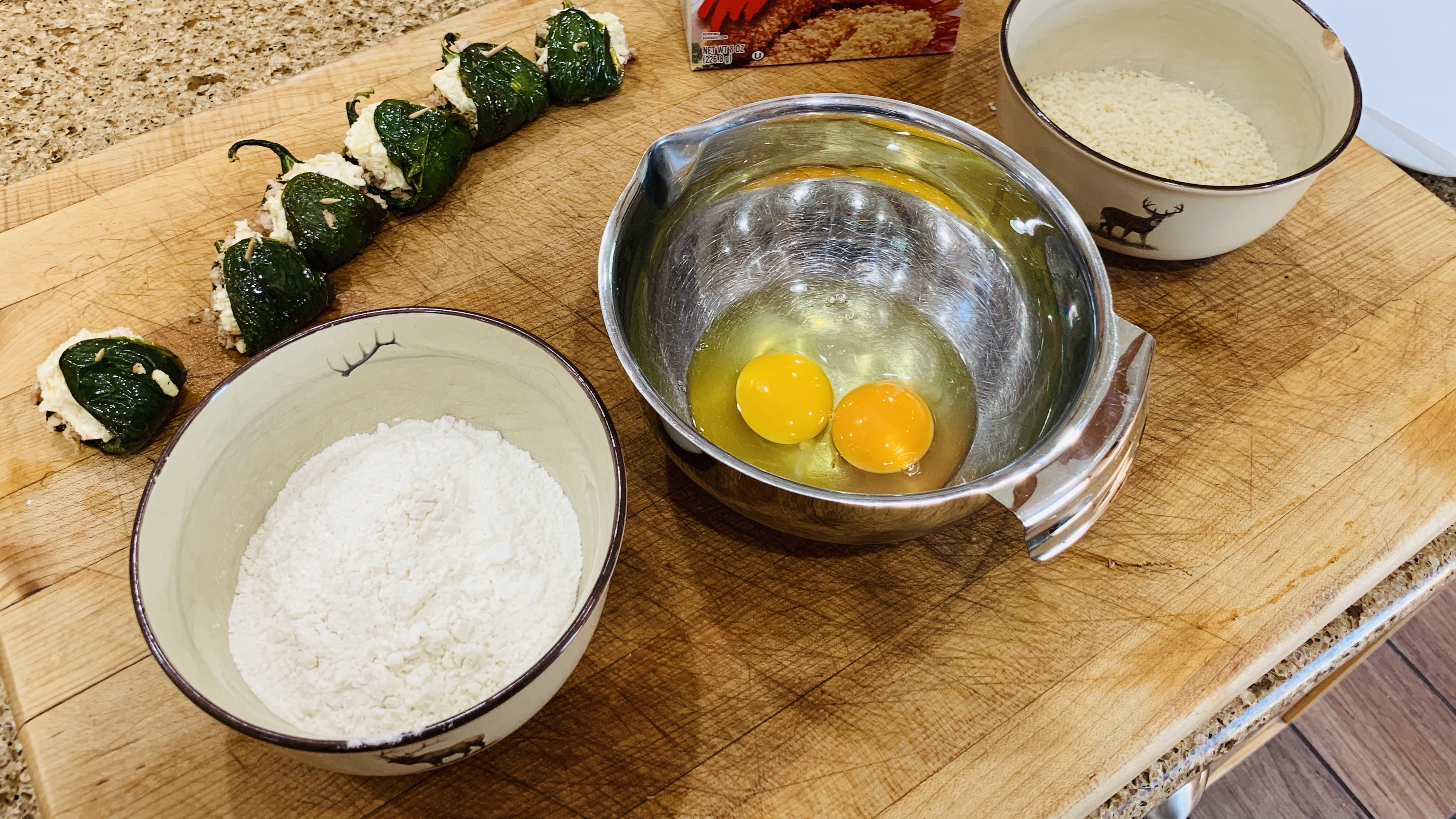 Now you are ready for assembling the popper. But before you do, get your breading line together and a few toothpicks. Scramble the eggs. This is the first decision you need to make. Do you like your jalapenos poppers crunchy texture? If you do use the Panko in the third dish, otherwise use flour again. I prefer the softer texture, but in this demonstration I used panko.