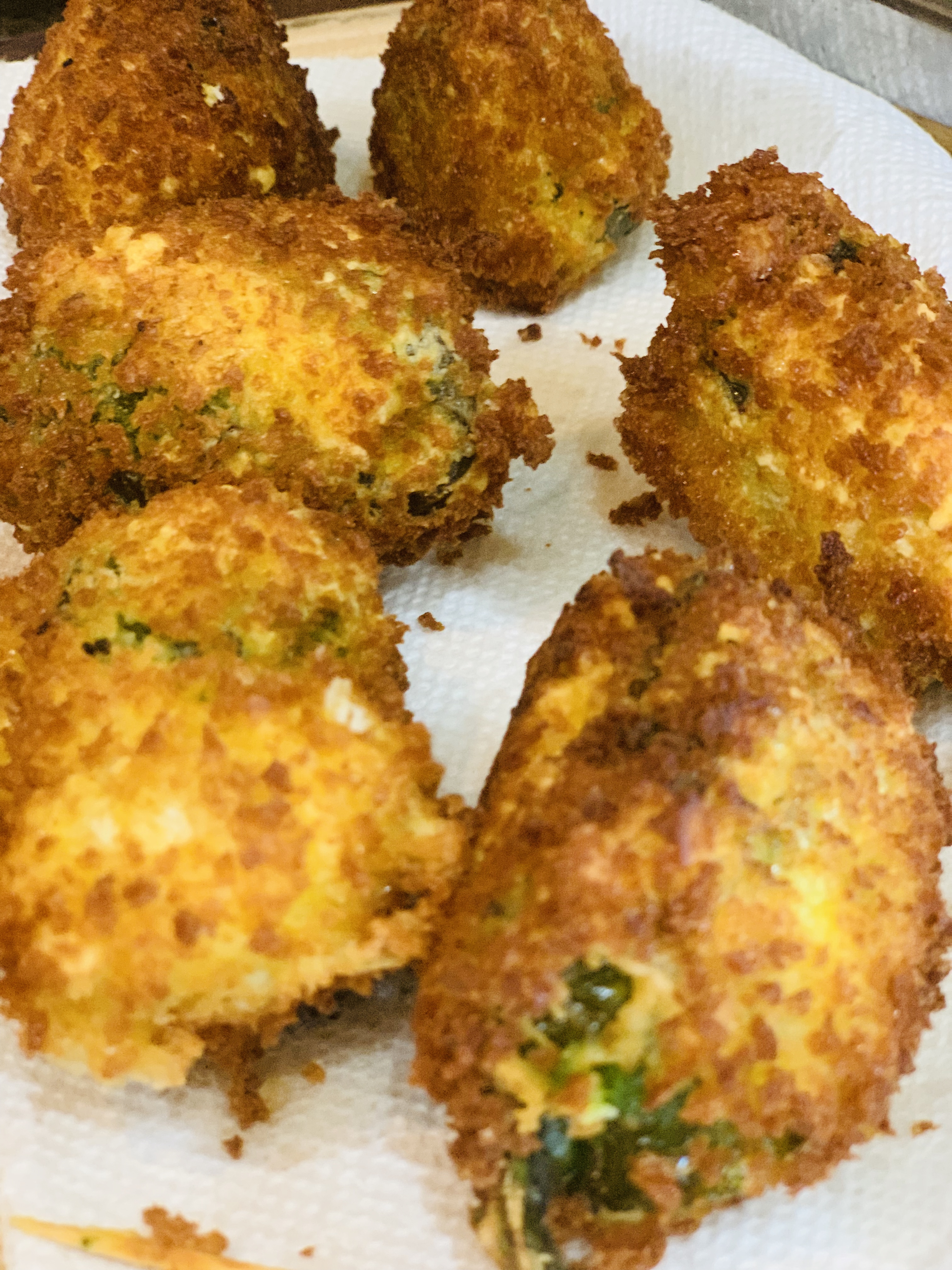 Your oil that you used for jalapenos we will use again. Get the oil up to medium high, and everything is precooked so all you want to do is brown them.